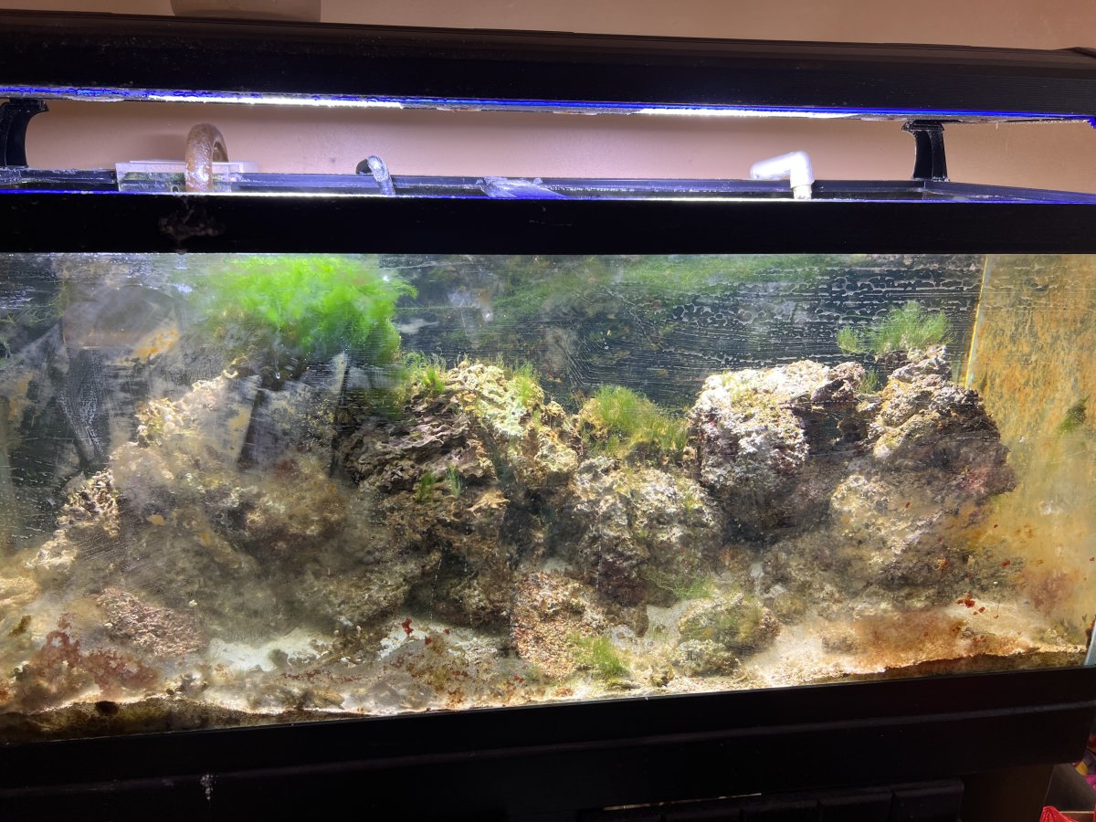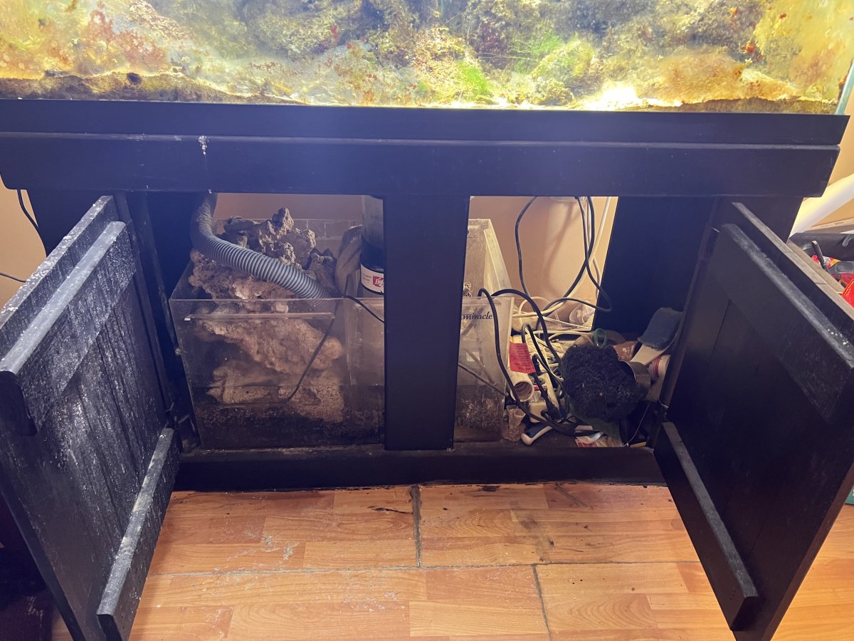 75 gallon tank and stand. Stand needs some paint. Tank is currently filled. There is a larger than needed overflow that leads to a two section sump (about 20 gallons). There is about 100 pounds of live rock. A mix of base rock and some nice pieces. Light is been off for a while so the coraline is gone. A Red Sea skimmer with electric pump. The sump has a return electric pump. I have a wave maker that’s works well and some various heaters. The light is a dual halogen (250w each) there are 4 fluorescent tubes. Two tubes are out but it’s unclear if it’s the tubes or the fixture.