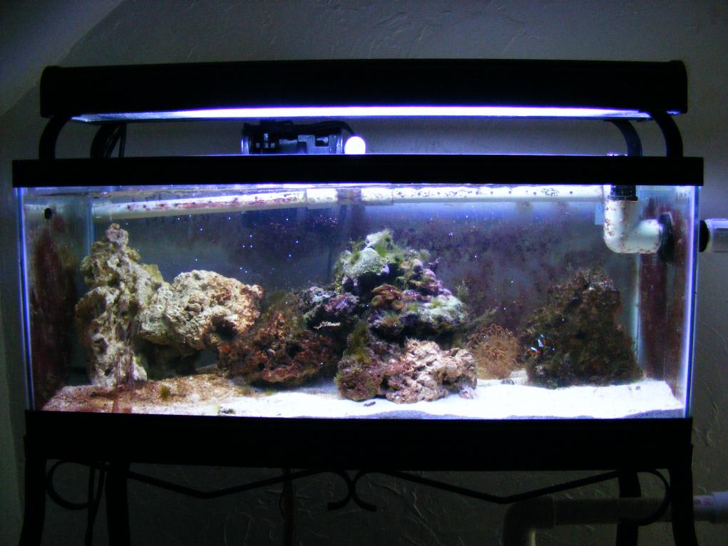 Ive been very busy as Ive recently moved. The return pump is a mag 3. I've got a hair algie problem that started when I put in a coral frag that I was given. Ive changed out the orignal bulbs that I have no clue how old they are. Now Im runnning Coralife 1 actnic blue, and 1 10,000 k daylight. Ive seen a huge difference in what little I have in the tank.I also made a diy spray bar that runs the whole length of the back of the tank and removed the power head.
