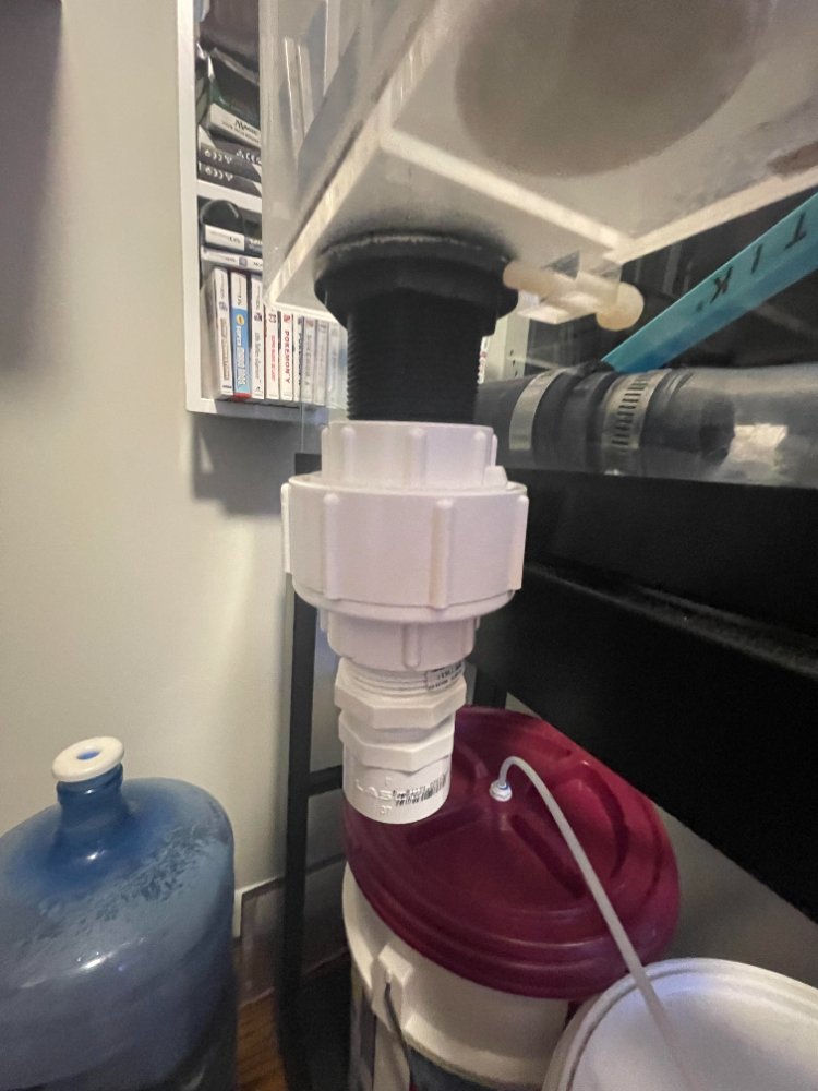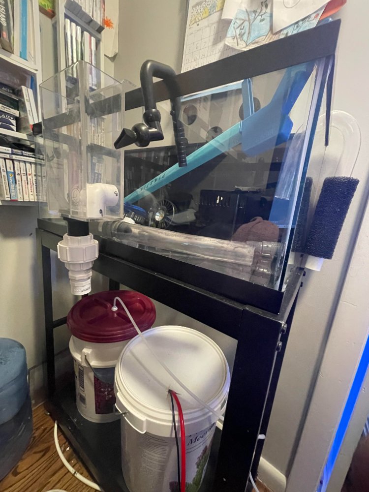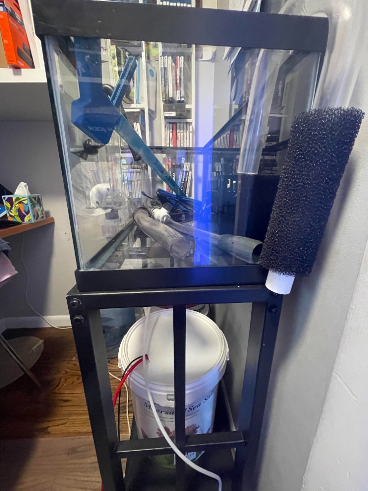 I was going to set up a remote fuge but after the decision to drill through the wall was vetoed I have decided otherwise. Hence, I will be selling the 20g L and with metal stand and eshoppes overflow box (with plumbing parts too which are expensive). Just needs a sump or bucket or whatever for a nice little setup. This was bought second hand but i watertested it and it was good overnight. Theres a little silicon mess in one corner but really not that big of a deal. The back is black and nicely coated too. I think $100.00 is reasonable bc the stand alone is worth that...its steel and very well constructed.
