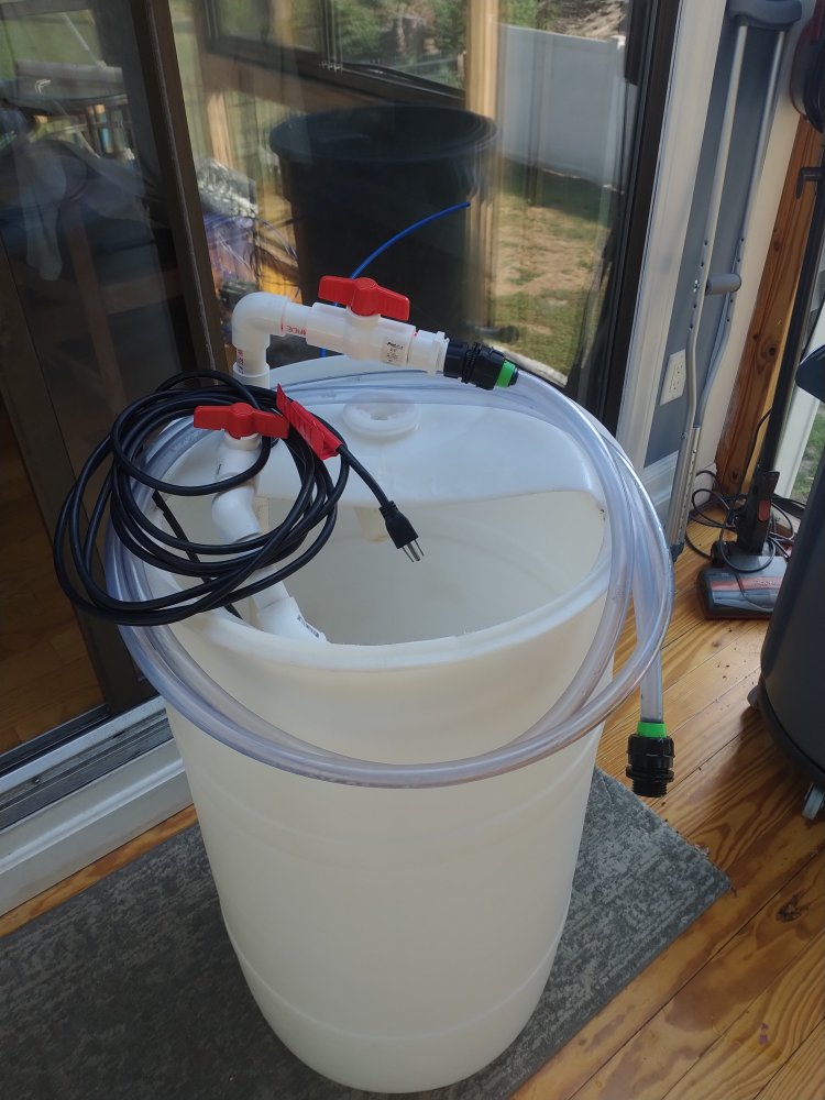32 gallon barrel with float valve, mag 9.5, 10 feet of hose and ball valves for mixing and pumping out. Pickup in Burlington $50
