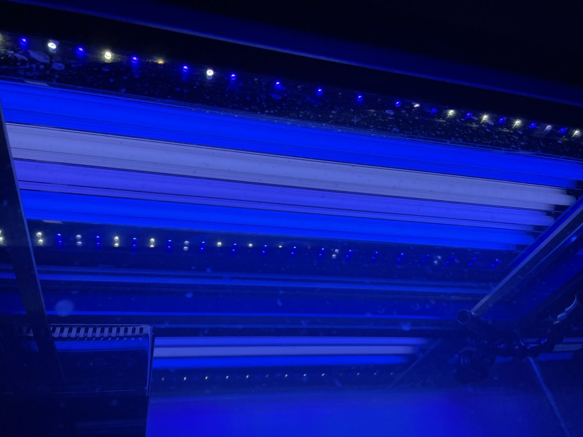 Finished the lights this morning. The frame is 1" aluminum and will be hung. I had the Current LED's and got an ebay 4 bulb T5 fixture. I finished it off with some dark blue plexi as a canopy that just lets some light through. The led's are programmable so I plan to use them for sunrise/sunset and have the T5's come on for a few hours mid-day. Really noit sure what t5's to use in this but have plenty of time to figure it out. I was really happy with the way this turned out.