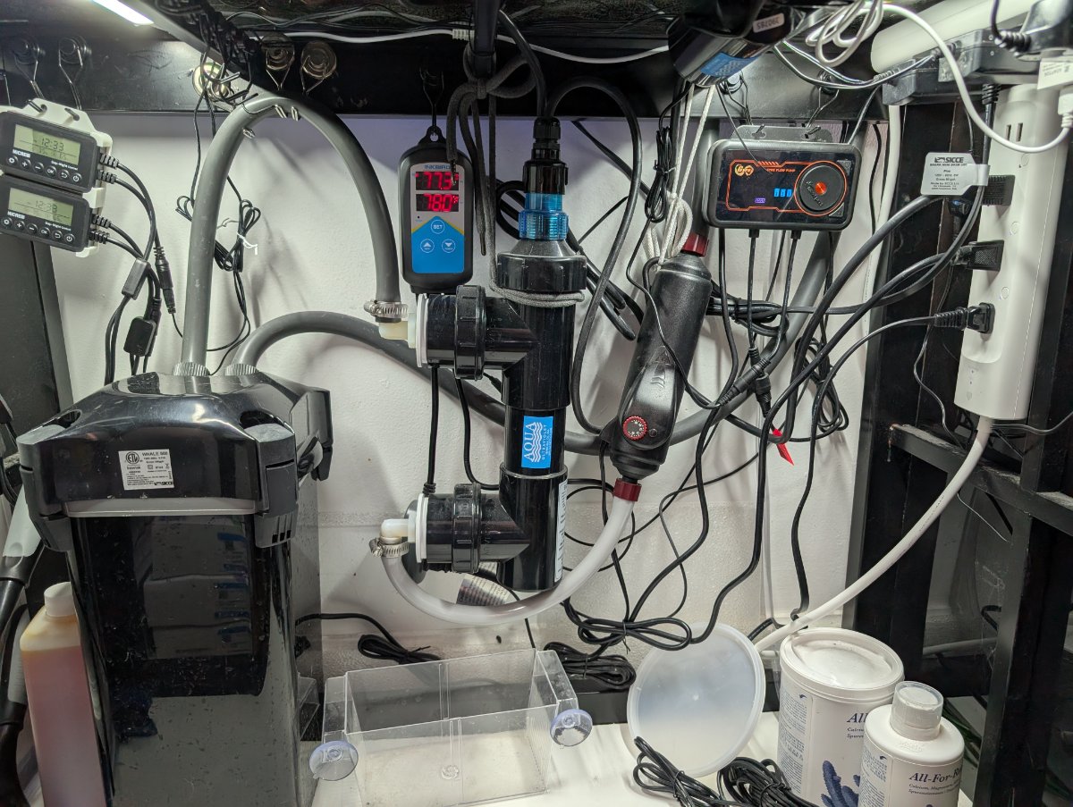 Standard 40g breeder setup with Sicce whale 500 canister filter. Not the most conventional setup for reef but I been growing softie and anemone pretty well with it. It may be good for someone who wants to do fish only or softie/anem/clown tank.