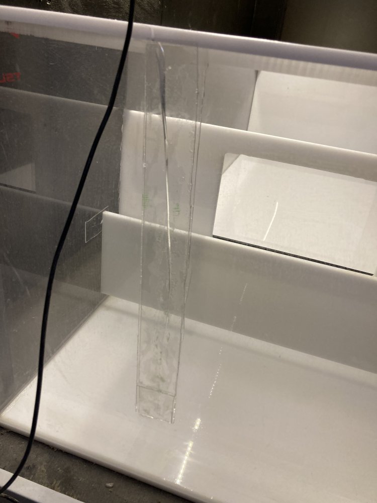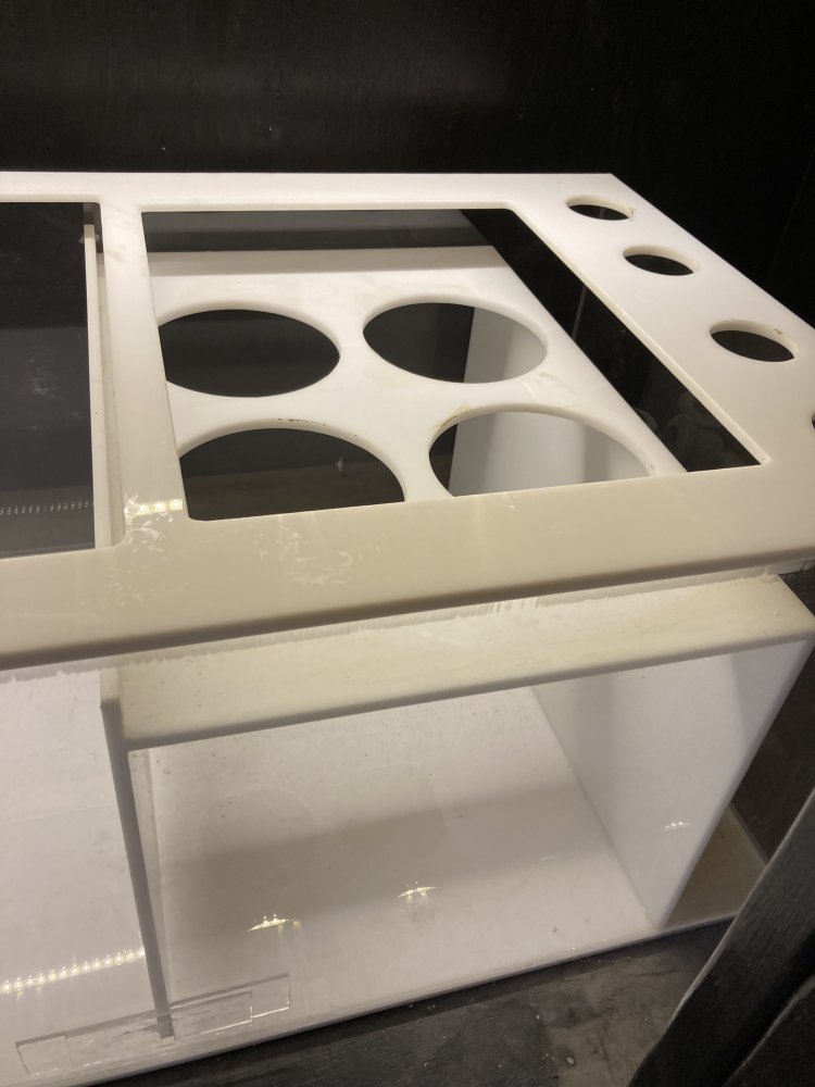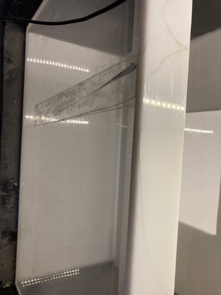 It has a stress crack on the return pump chamber side from when I had it shipped. Filled it with water for a few months and ran a power head to move the water around and it was fine. I sandwiched two piece of acrylic on each side of it with weld on.