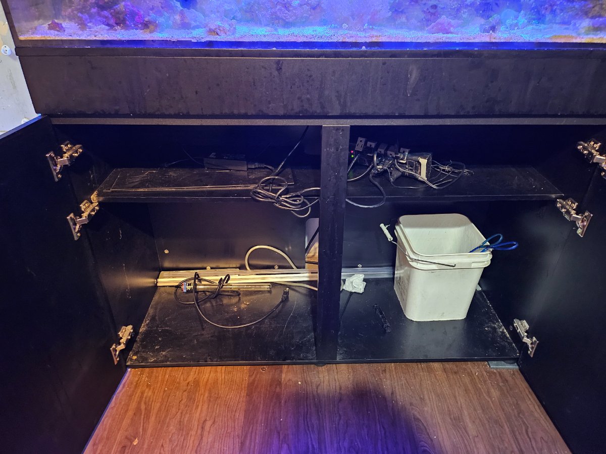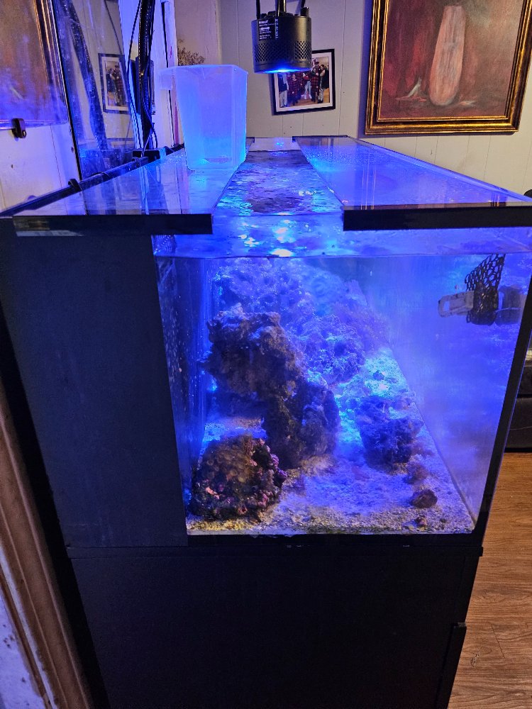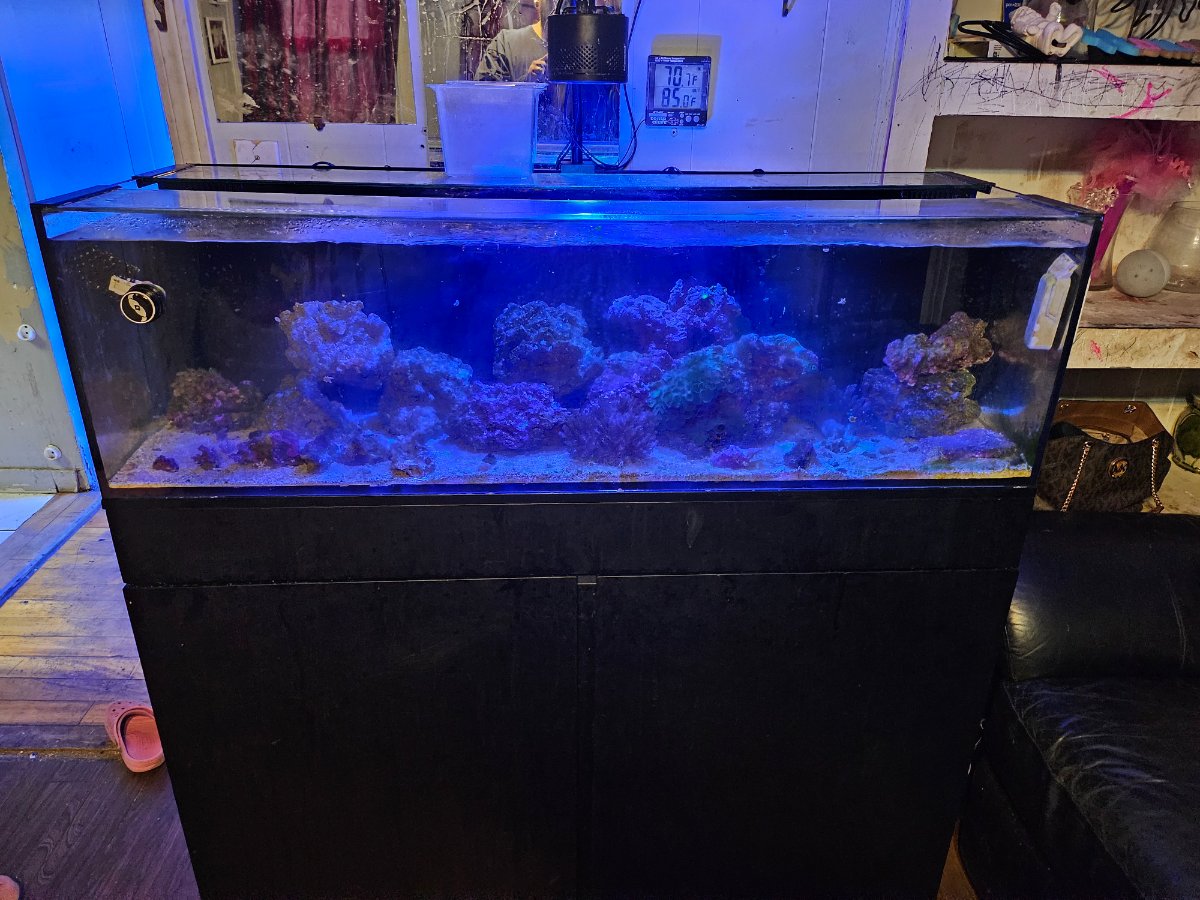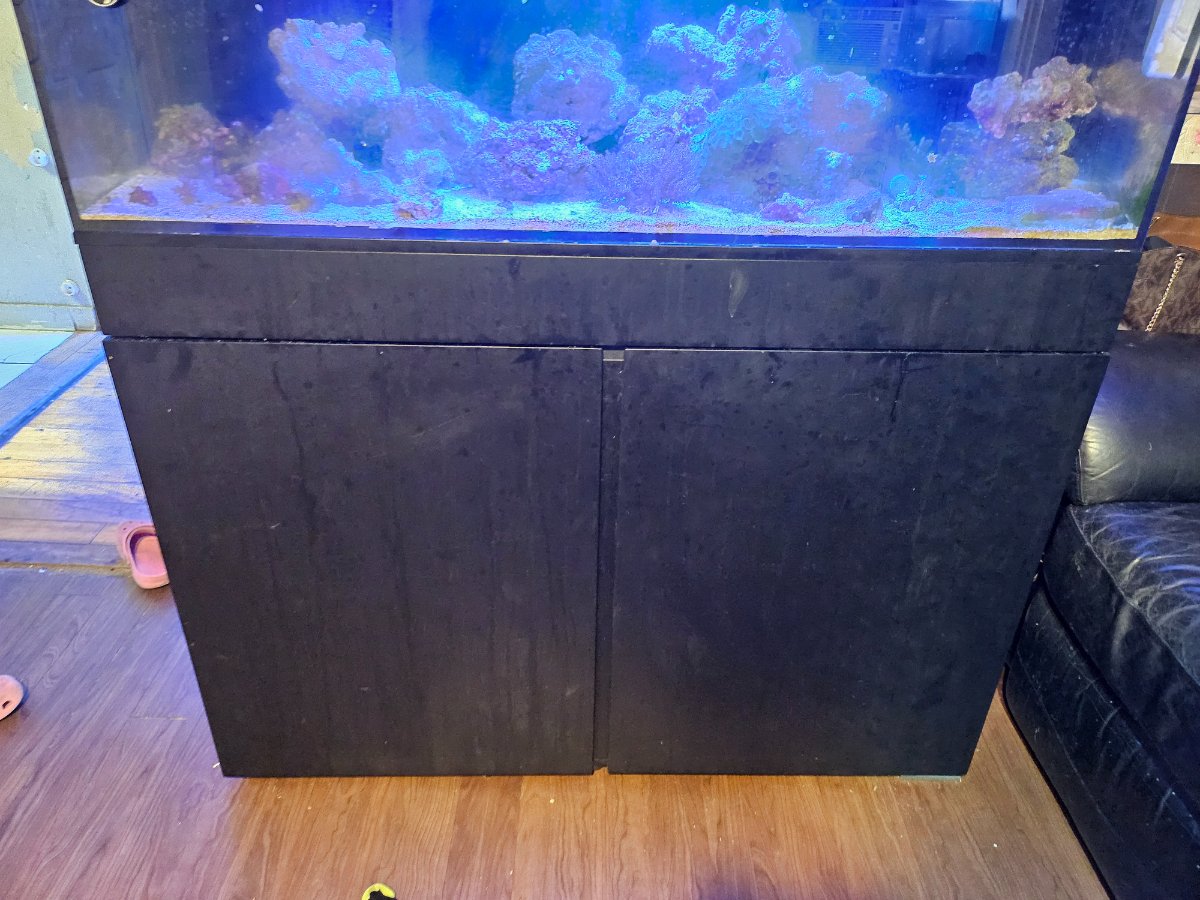 It's a colbalt 50 gallon all in one rimless tank stand glass lids return pumps heater and fluval ps1 protein skimmer tanks 48"L×18"W×14"H 50" off floor with stand asking $400