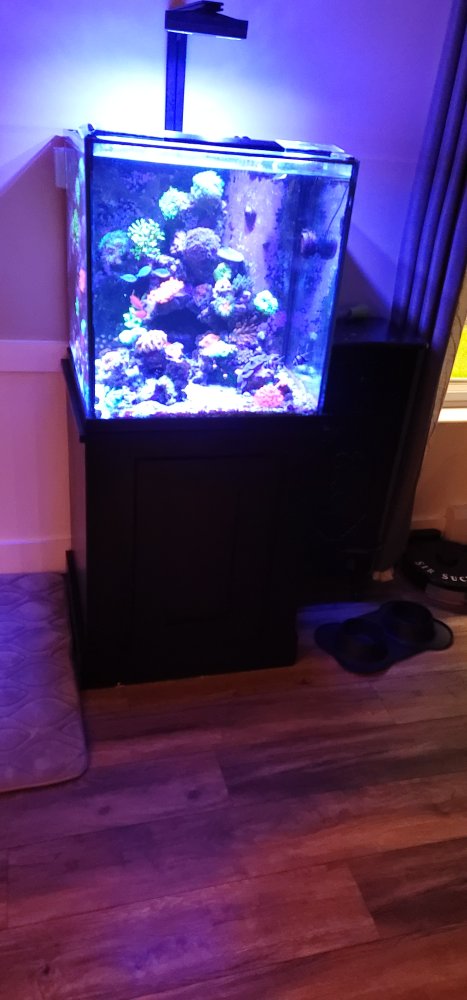 60 Gallon Rimless Cube corner overflow good condition (no noticeable scratches just emptied 9/02/23 black stand (could use a little paint on stand and a good cleaning) Jebao Return pmp and Jebao flow pump, home made sump, piping, sock hanger, older auto top off with 2.5 gallon tank for fresh water. Last picture was it before I transferred everything to my new tank... $225