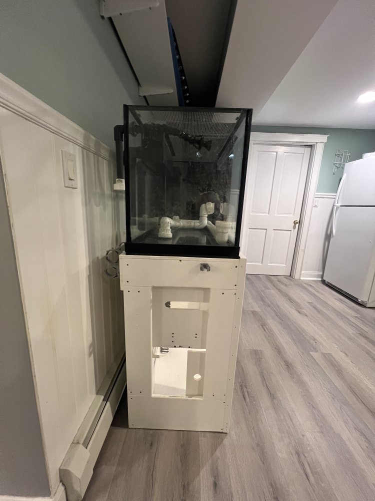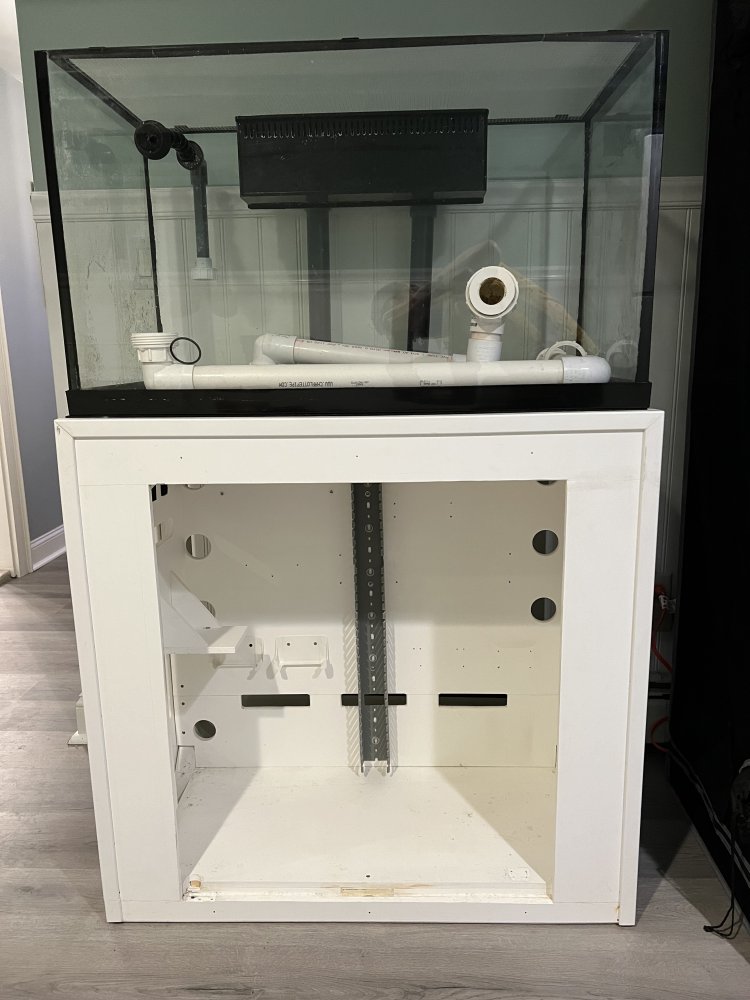 Looking to sell my 60g rimless tank, reef ready with overflow box, stand, and mesh cover. The stand is as seen in the photos (i.e., open, no front or side door). Dimensions are 36x18x21. I have a bunch of plumbing pieces I can include, but the way this was previously plumbed was connected to a larger main display so the plumbing would need to be adjusted.