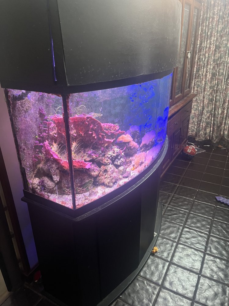 72 gallon bowfront with custom built canopy sump and modified center brace.