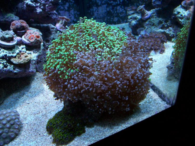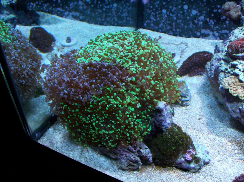Tell me what you think of this. 8" cantaloupe size frogspawn with purple/green zoos all around it on the rock. It's starting to sting some of my corals in my 60 cube. You can see where it's tagged the scroll and now getting close to acan ledge! It needs to go in someone's 125. I has 15 heads and is huge. Thinking about selling at April meeting.