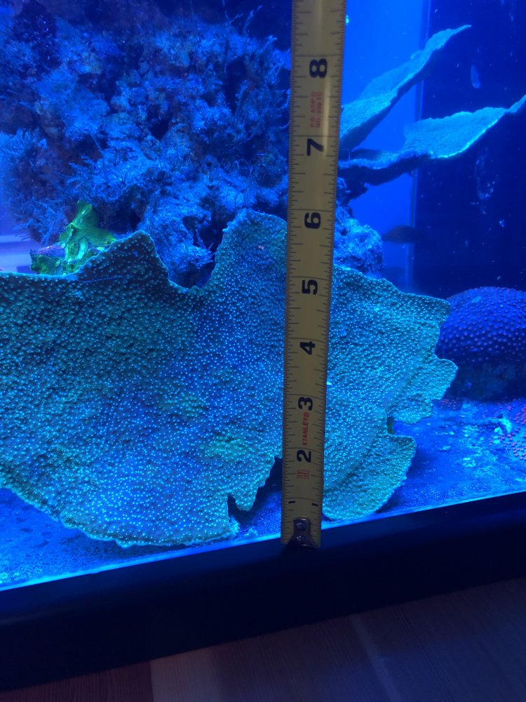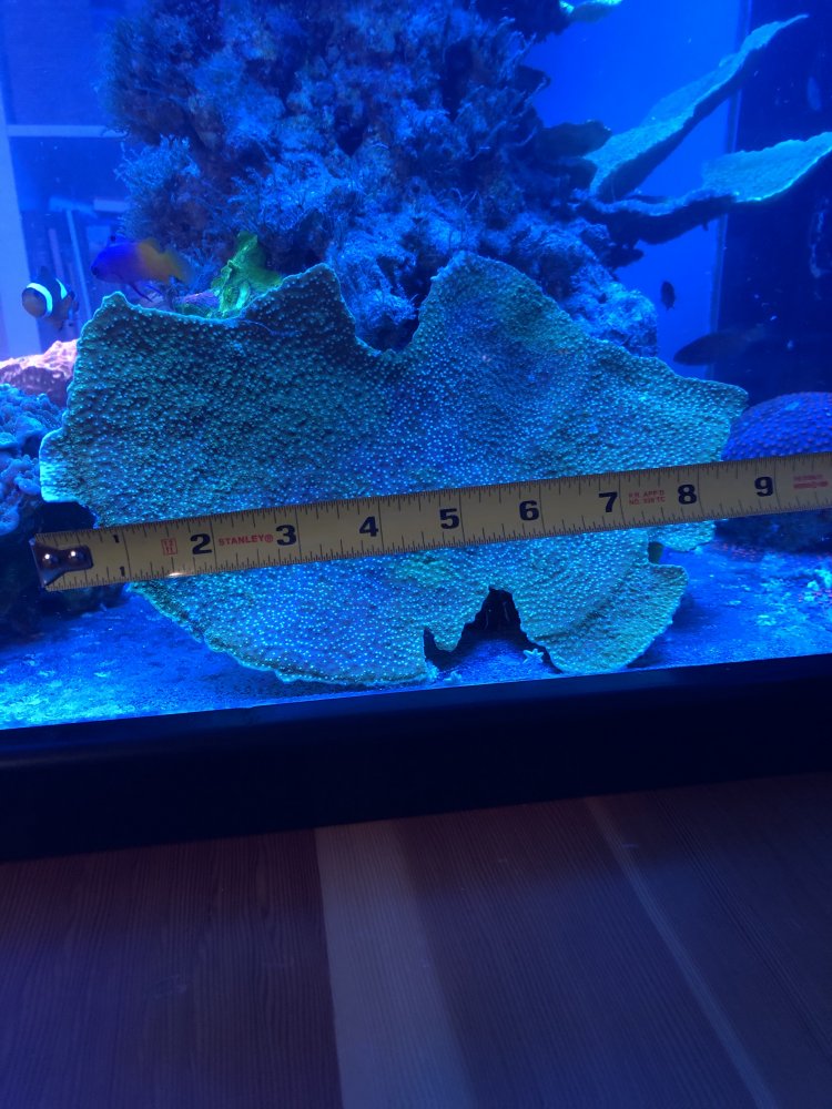 I have a 9"x6" piece of Leng Sy Monti Cap that I accidentally broke off while cleaning. You're not seeing much color on the rim because I have it in light that is too low, and only my blues were on for this pic. I bought this from Dong a couple years ago and it grows extremely fast. I have grown it to 20"x8" from a 1 inch frag in the last two years. Twice.