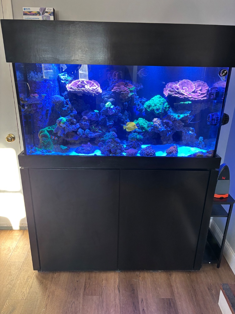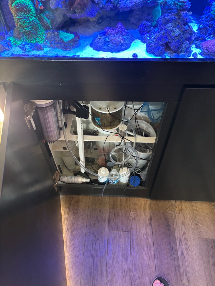 Underneath, the tank is professionally plumbed with PVC assembled with unions for easy removal and installation. The sump is a ProClear 200 series sump that is approximately 36 inches x 12 inches. Water is returned by a Simplicity 1600DC that was just replaced in October of 2024. Heat is provided by an INKBIRD 300W heater from BRS. Skimmer is a coralbox, not sure the exact model but it was rated for 90 with a heavy bioload.