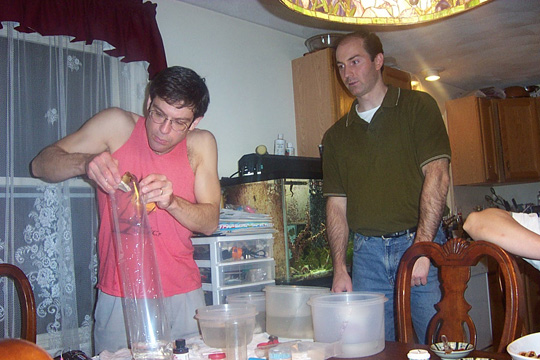 And a couple others including me anxiously awaiting the bagging of my orange cap frag at the second of Greg's home coral fragging tutorials. That coral has made the rounds! Excellent food too that night btw.