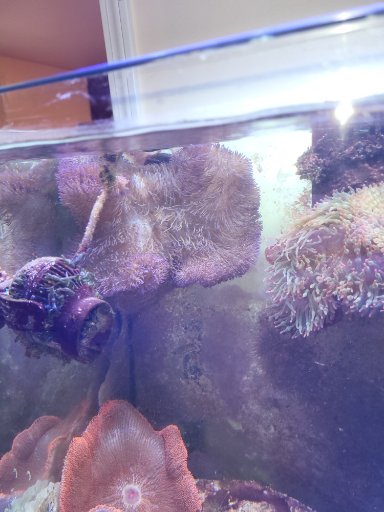 Purple Haddoni Anemone - SOLD. I bought this from a website I cannot even remember the name of. I never directly fed it. Just let it catch the food I fed my fish. Once again crowed by the red. I used to have them spaced out a lot nicer but changing powerhead positions caused them all to go into corners.
