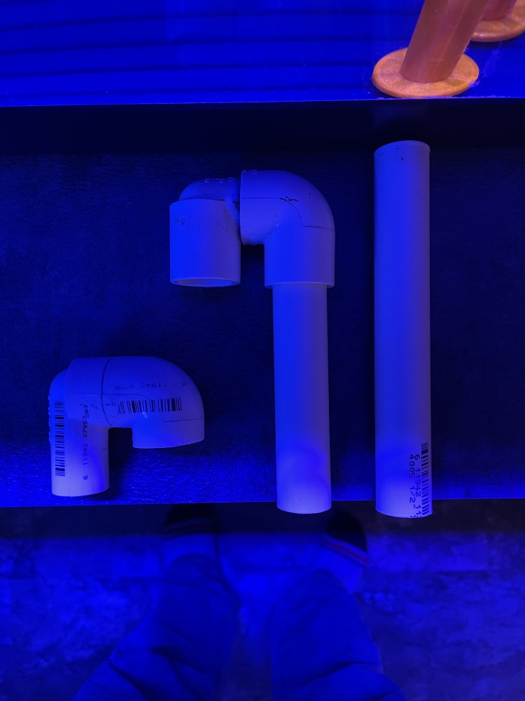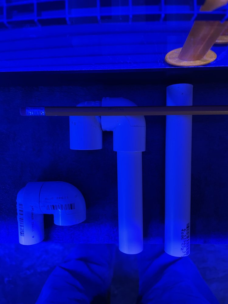 I can't get this thing working right and looking for some suggestions. First picture is essentially what the overflow box looks like with the approximate heights of each. The primary drain on the left has a gate valve to adjust flow. The middle drain, I assume, picks up any excess from the primary as sort of a check valve to limit adjustments. The emergency is just that. Both drains have their ends about 2" under water in the sump. The pencil in the second picture is about the water level I think it should be at when running right.
