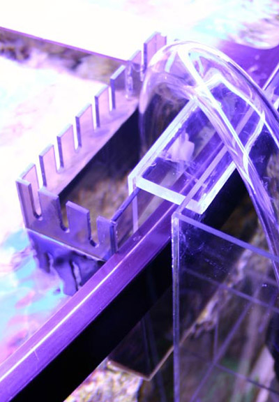Used a handheld router with a template to make the teeth on my overflow. Just cut a U-shaped hole out of a piece of MDF the length of the radius of the router plus the length I wanted the teeth to be. Then cut a groove about 1/8" down on another piece and sandwiched my acrylic between this piece and the template. Here's my finished project: