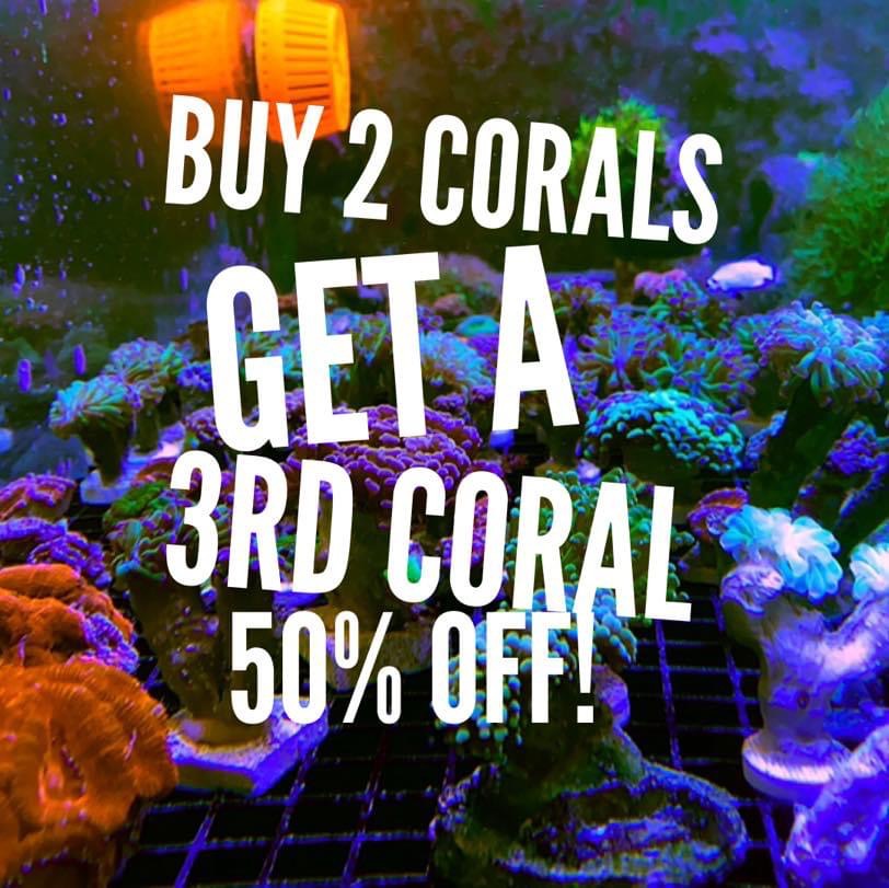 All Coral : buy 2 at regular price and get a 3rd @ 50% off (frag tanks are well stocked)
