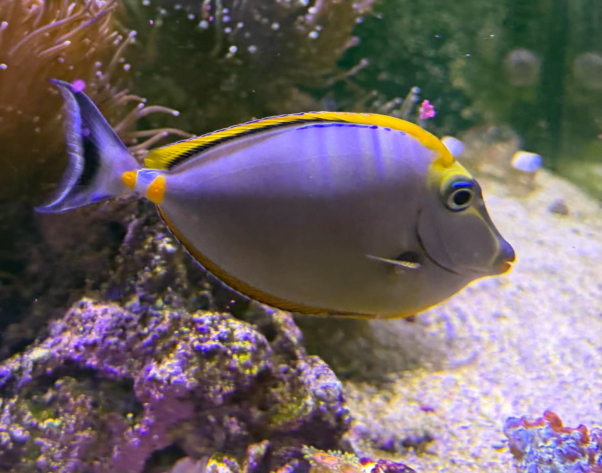 5". Starting to grow streamers. Purchased from All Things Aquatic on 10/1/24 and went thru a full quarantine. Has a ton of personality and very healthy.