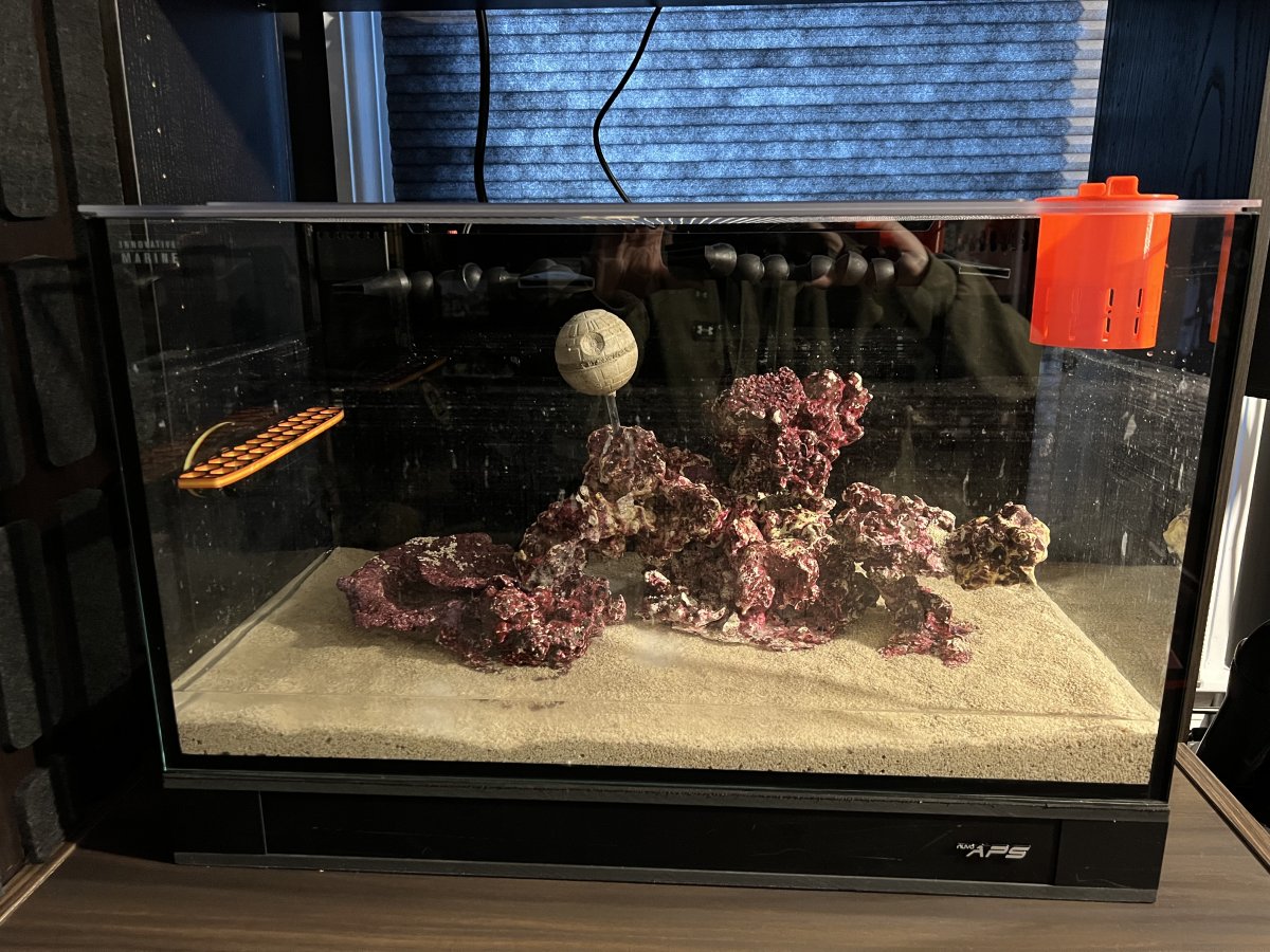 I started to fill this and the furniture it’s on will not support it. Even though I added braces. So for now it has to go. Need it gone asap so priced to go. Brand new innovative marine fusion 20 gal with real reef rock sculpture I just put together. Sand was just added today. I will include the salt I have left. I was going with aqua forest reef salt. I also have two brand new 5 gal containers of their perfect water included as well. I’ll include the frag rack and the Death Star from jester6. Comes with mighty jet pump and return nozzles shown. Also has kraken reef lid with evap cover and reactive orange feeder cup. Asking $300.