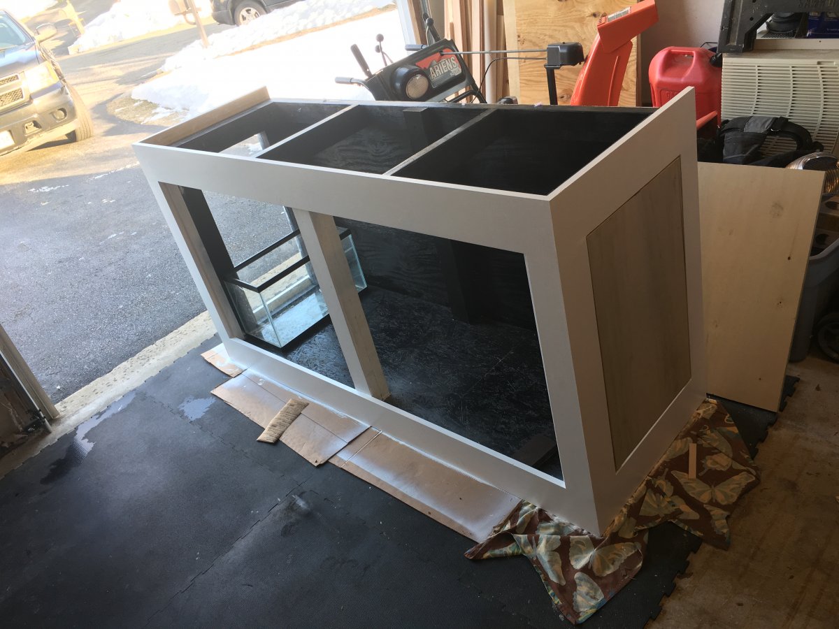 As of now the interior frame is painted with a glossy black water proof paint. Yes, I wanted it black to notice any salt creep so I can clean it up as I notice it form. I’m a little neurotic with stuff to say the least. The exterior trim has been formed out of poplar and will be painted white to match the room. It will have a matching canopy that will be fully automated, raising and lowering with the flick of a switch via linear actuator. Still in design. The canopy will house 3 Kessil A360’s and six 60” 80W T5’s as it will be predominantly SPS. I was debating on radions but I'm a sucker for shimmer.