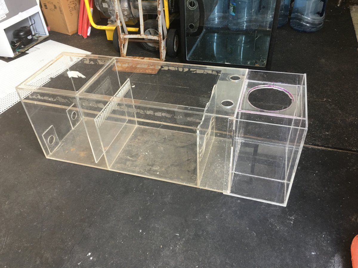 Plumbing will contain 6-8 unions, 4 gate vales, and be 1" red pvc all around with white joints. I still haven't gotten to a dry plumb as the stand and sump are not complete. The sump will be built off of a 50G acrylic sump that came with the tank. I was hesitant on using this as it did not have filter sock holders and wasn't sure if the Regal 250INT skimmer I purchased would fit. Once i realized the skimmer fit perfectly I was set on using this sump. I snagged a 2x4' sheet of cast acrylic off amazon for $50 and began meticulously cutting to make a 4th chamber/filter sock holder in the sump. Cutting the circle for the sock free hand with a broken router was quite the task....