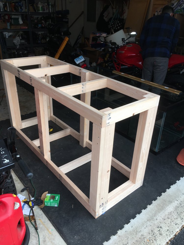 Now that I’m working, the process has taken much longer than previous builds. Probably for best. As they say, this is a hobby of patience for optimal results. I had an idea for what I wanted for a stand, drew it up, made the measurements, and purchased the needed materials. The frame would be built out of premium 2x4’s with 10 support columns aka about 6,500lbs of capacity. More than enough for 180+/- gallons and 200lbs+ of rock.
