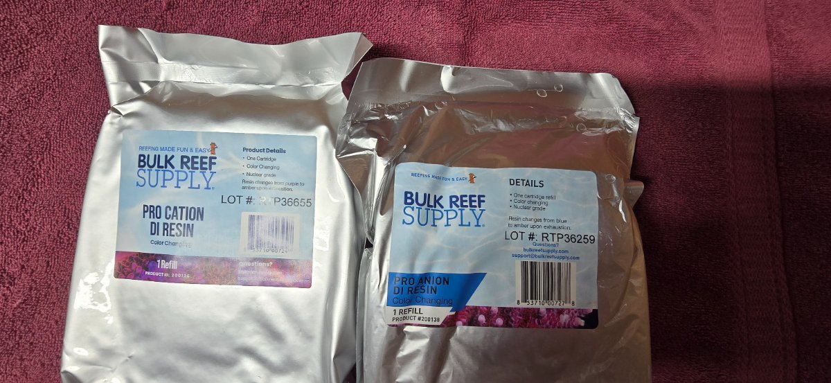 I have one unopened of each, Cation DI resin and Anion DI resin. Went back to mixed bed resin. Asking 15 each or a frag. Pm with interest.
