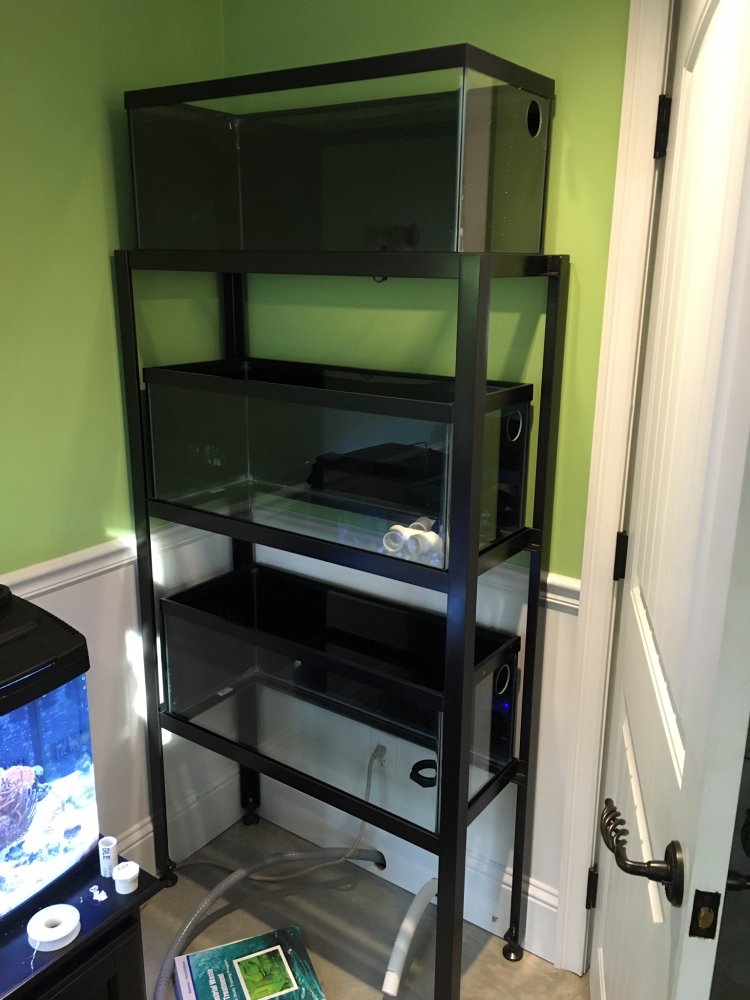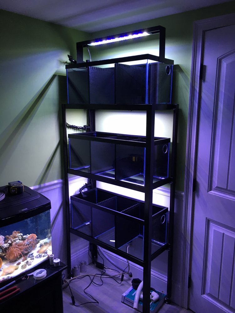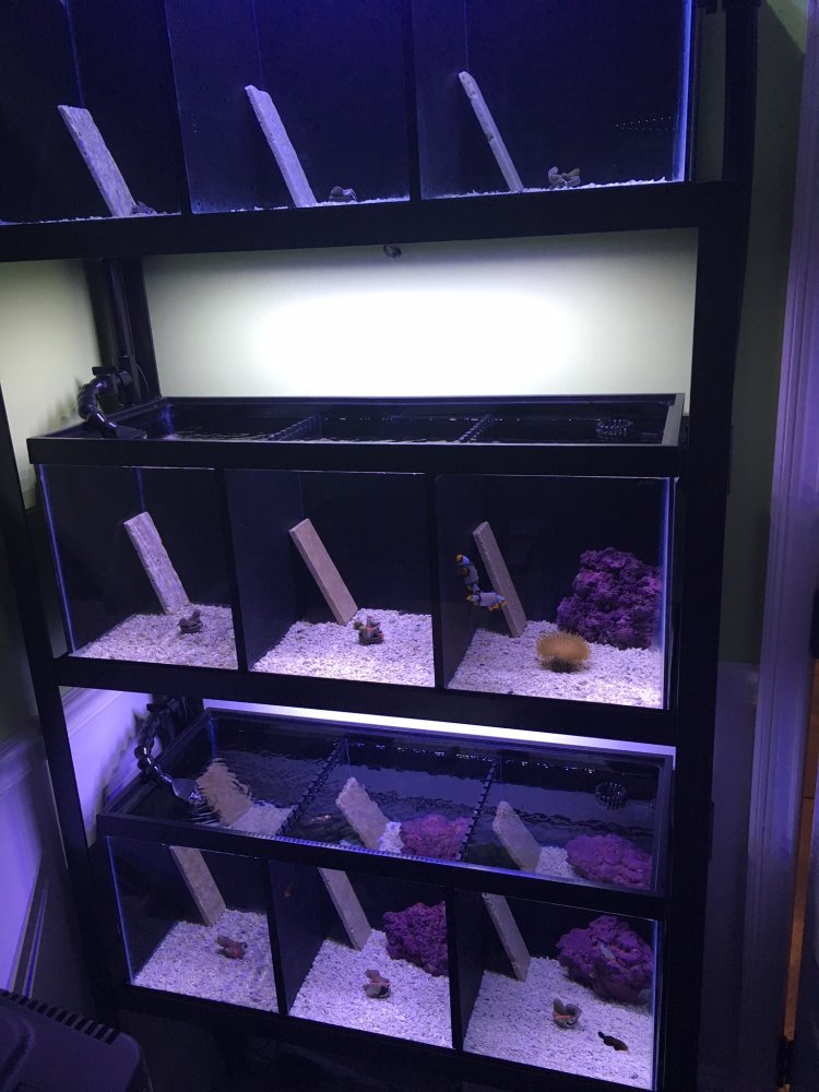 I have 3- 20 gallon long tanks each divided into 3 compartments. The lids are custom made as well as the stand which is all stainless steel. The sump which is currently plumbed into the basement is a 20 long. I have a Theiling roller mat, DC return pump, DC skimmer & an ATO kit. Apex Jr with probes, led strip lights. I also have 18 - 5.5 gallon tanks with lids drilled with bulkheads. As far as the pairs, here's what I have: