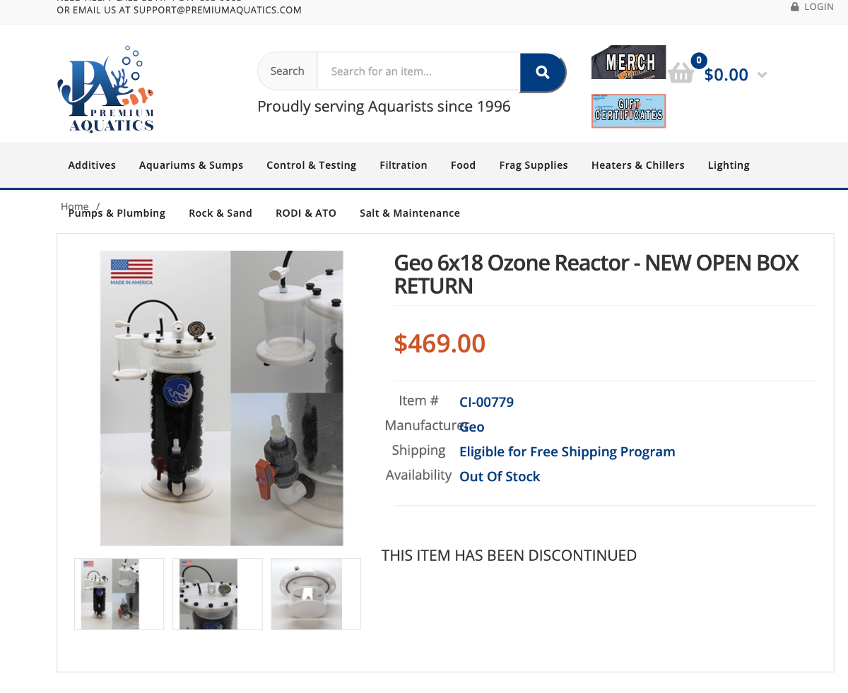 Link to Discontinued Gen 1 Geo reactor https://premiumaquatics.com/products/geo-6x18-ozone-reactor-open-box-return.html