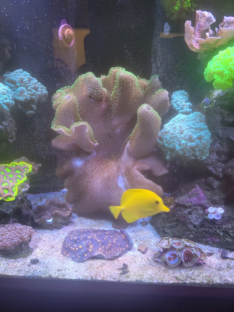 Large show size green toadstool size of dinner plate 12+ inches pic of tank is a 90 gal 4 foot tank so you can see size of it asking $200