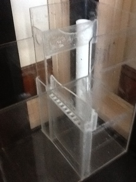 I then removed the tiny refugium section above and turned this into my internal return section. There are 2 baffles, the first keeps the skimmer section constant. The second is about 1" off the bottom to trap bubbles. As a backup I installed egg crate that allows me to place some filter material to stop bubbles and trap anything that got by the skimmer. I am not concerned about changing this because it takes about $.10 worth of filter pad I will pre-cut and have ready. When it gets dirty, out with the old in with the new.