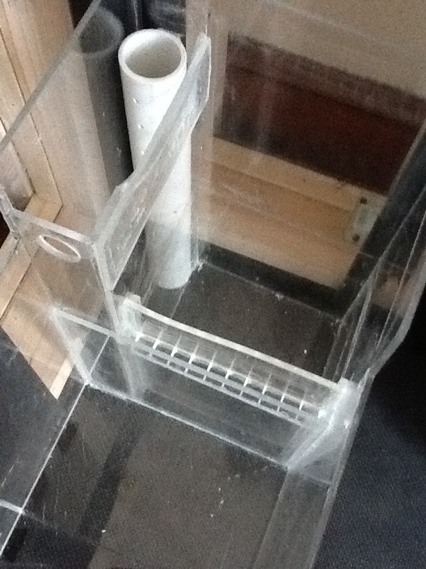 First I cut the sealed top off the inlet area. It was dirty and there was no way possible to clean it. I thought I could make better use of the space. So I install 1.5" pipe with holes placed strategically on the pipe. I plan to fill this chamber with LR rubble and have my drain enter the pipe which will keep flow on the rocks. The hole in the front is where the water will enter the skimmer section. I will have a 90 pointing down to direct the water. This also should help keep bubbles reduced.