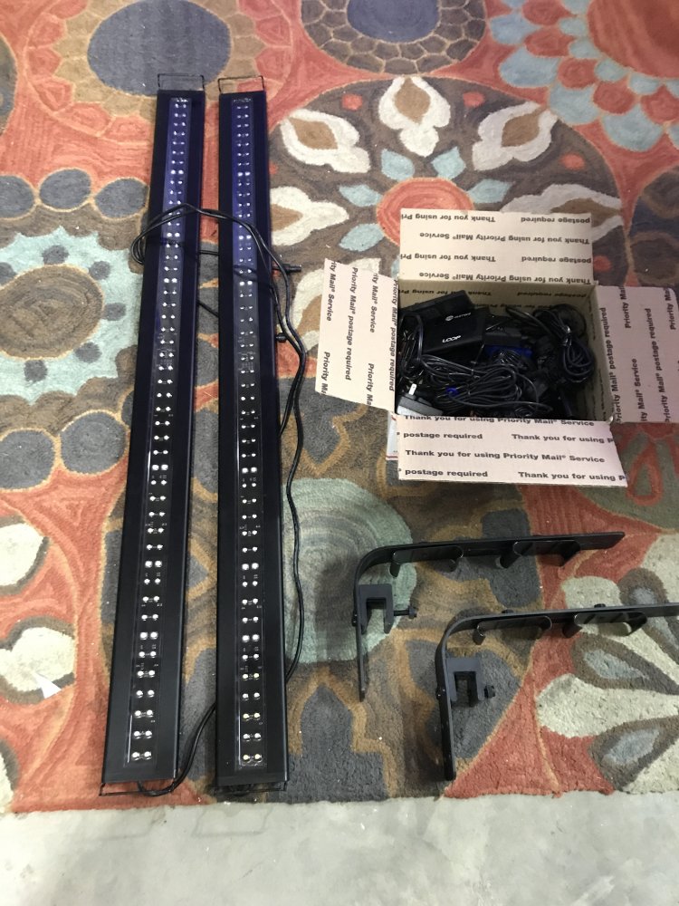 This is less than a Year... comes with 2 48-60” LED Strips with 3 1025gph wave pumps and mounting brackets. Loop System, all Equipment controlled by one remote. Works great for Softies and low light LPS... Might get away with lowlight SPS if your tank isn’t deep. Perfect Condition. Always used glass hood so never got salt creep. $200 or Trade for a smaller LED for QT.