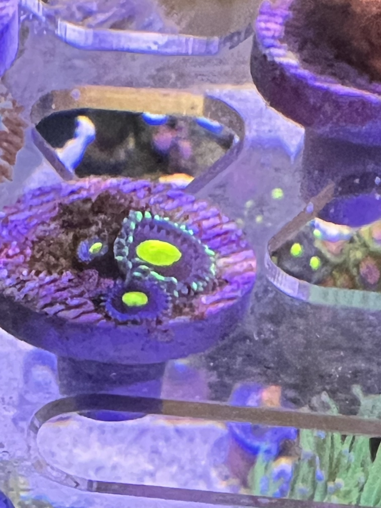 KOI - This is a rare variant of the more popular WWC AOI, but has bright yellow in the lashes. Only have one frag available, 1 full polyp with 2 babies: $80