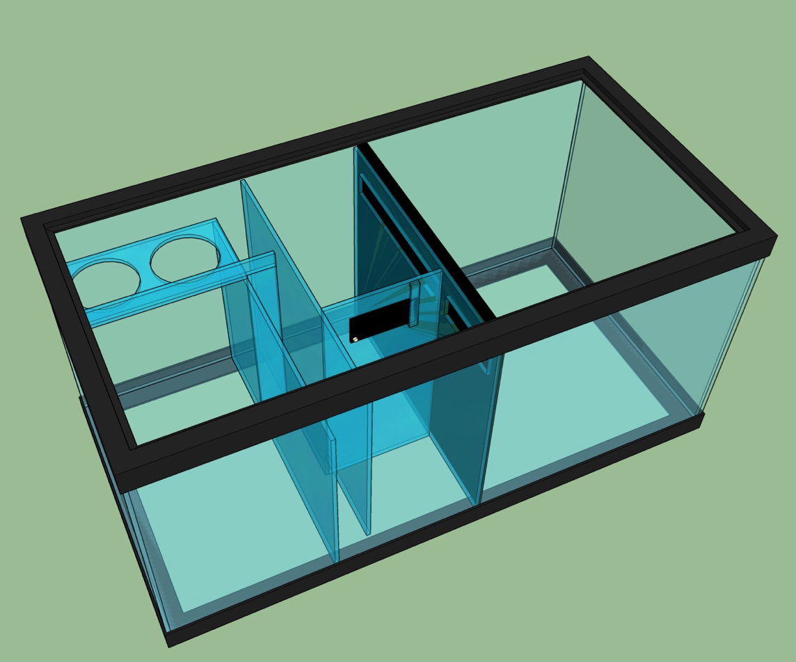 This uses a 40g breeder. I planned to try it out with glass baffles. The local glass shop gave me a bunch of ¼” plate glass "scraps" for free, so taught myself to work with glass (youtube) and planned on glass baffles. Through practice I decent at cutting glass and even making odd holes, cutouts etc.