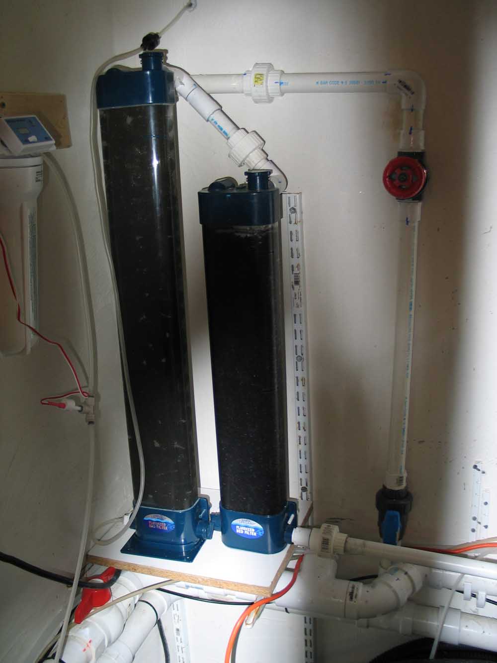 Water enters the same chamber at the top through the small fluidized bed channel inside the reactor and meets the ozone inside the chamber at the bottom of the chamber. The input wter flow is adjustable via the the red gate valve and is set to around 60 gph. The water/ozone level rises in the chamber and passes through bioballs to maximize dwell time. The water then exits at the top of this chamber. The ozone gas pressurizes the reactor chamber and the pressure can be increased by slightly closing the output water valve at the water exit port provided by the FB900. In a future mod I will add a needle valve to adjust air pressure into the chamber. The ozonized water then enters the second chamber (the one on the right), filled with GAC, at the top. This chamber is NOT pressurized and there is an air gap at the top where the water enters this reactor (FB600). The water exits at the bottom of this chamber into the sump.