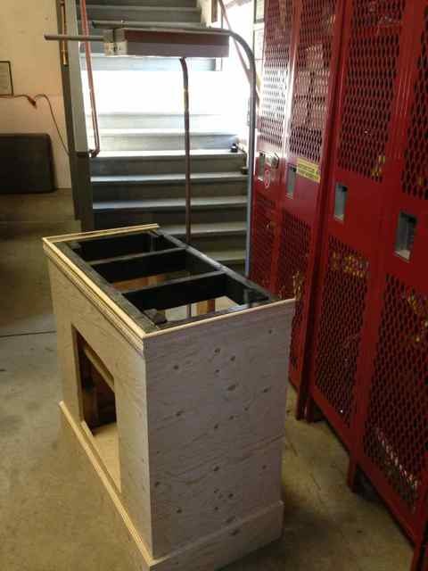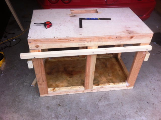 The bottom frame with 1/2 ply. The bottom OG the stand will house a 20 gallon sump and 5 gallon top off tank. Note that I cut out space for the corner legs, but forgot to cut out a space for the center legs. Doh. I used liquid nails as my binding agent and nails to hold everything together While the glue was drying.**