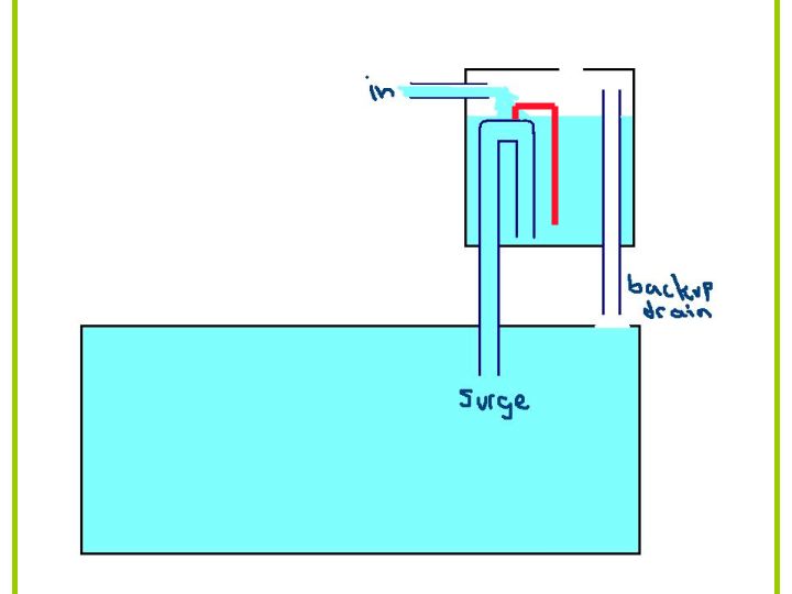 When the surge bucket is filling up, doesnt this affect the water level in your sump?, I have a top off float valve down in the sump this is going to kick in when the surge bucket is filling.
