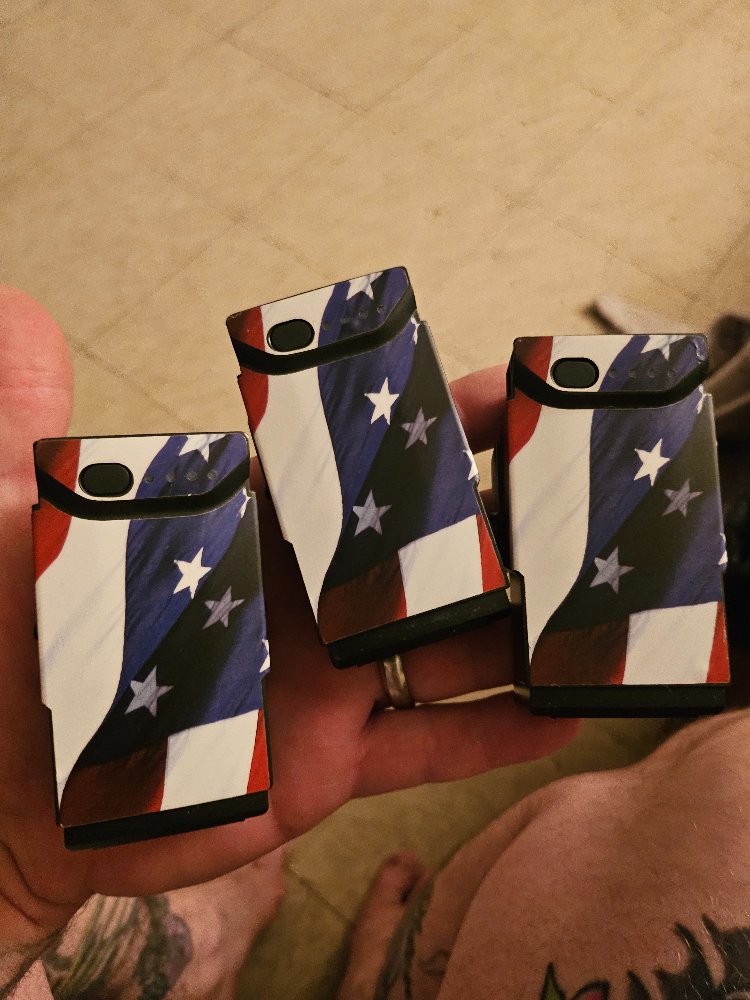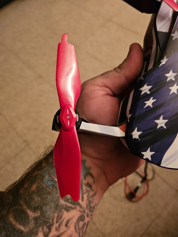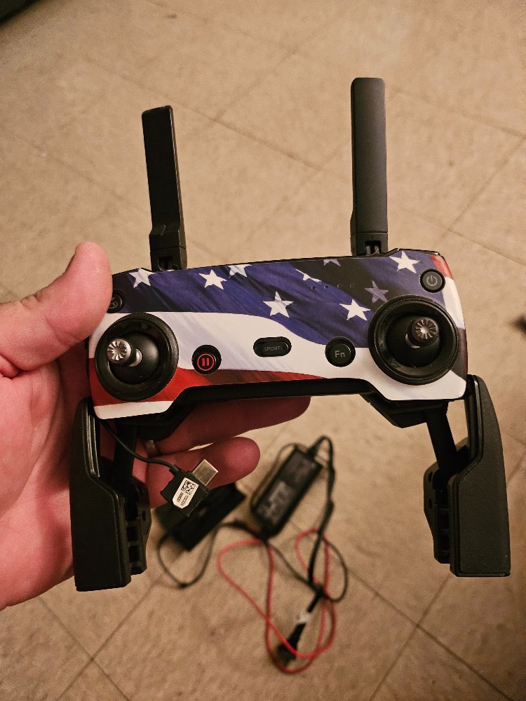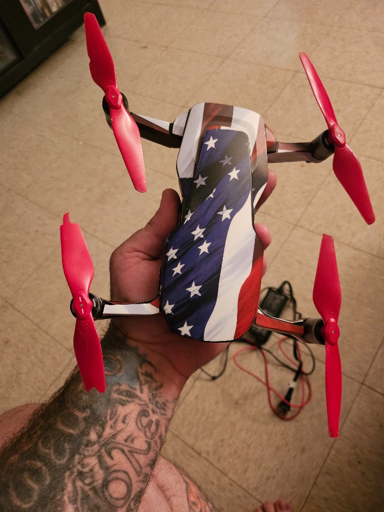 Dji mavic air 4k drone has American flag skin carrying back pack 3 batteries and charging station for 4 batteries blades chipped but work fine replacement blades are cheap online to buy