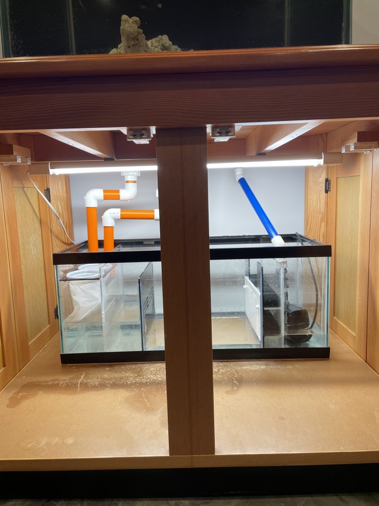 I'm at the last stage in plumbing a new build and need some advice. I'm using an eshopps overflow with two drains, typical herbie setup I guess. Where the pipes enter the sump is where I'm having a hard time. Some information says both pipes should be about an inch below the water level. Others say leave the emergency an inch above the water level so you can hear any problems. Some pictures of installs I've seen show both pipes submerged several inches into the sump. I'm going to leave that last piece unglued until I figure it out but I was curious about how others have done it and why.