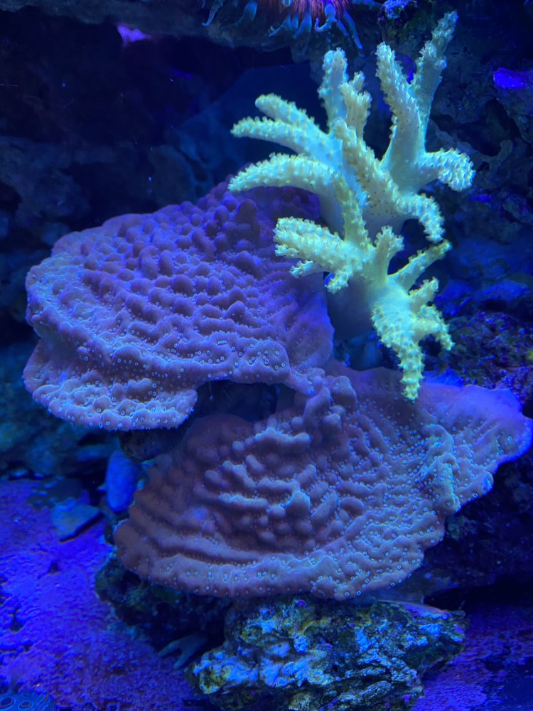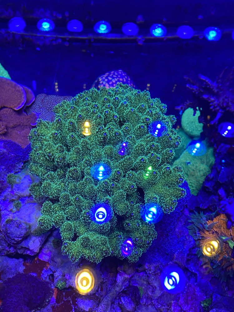 Also have several large montipora true undata (4"-5"), a large 6"-7" green pocillopora colony and a 7"-8" large rock covered with green frilly fluorescent shrooms. $25 each