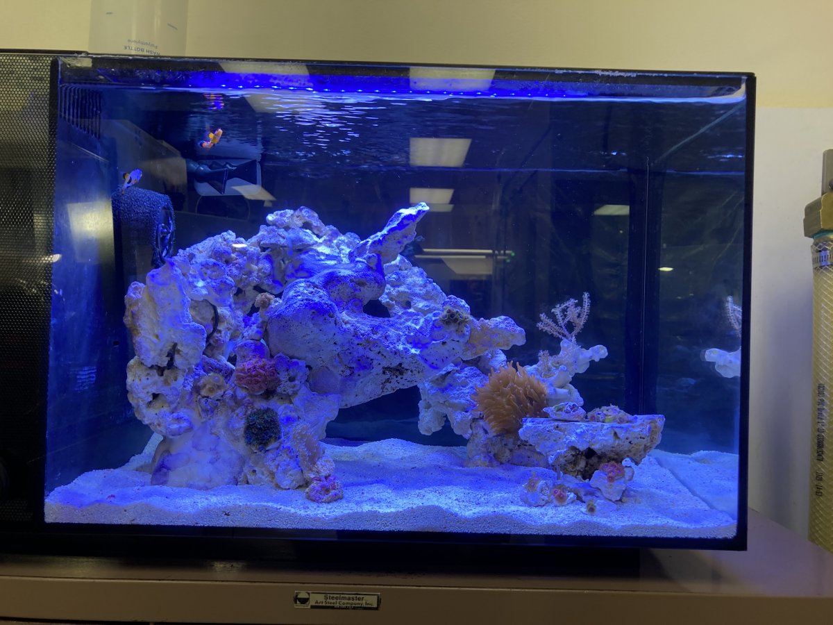 Cycle was fairly minimal thanks to using about 18lbs of cured live rock from nearby reefers. I had a small ammonia spike in week 1, but it didn’t even irritate the mushrooms or zoas that came with the live rock. I ran for several weeks with just the rock anyway and did a little bit of ghost feeding (frozen brine). First frags added last week, as was the blenny. I picked a few more up from Dong and other reefers this weekend. Now I’ll monitor (and maybe move some frags) for the next few weeks to see how things adjust. But so far, so good.