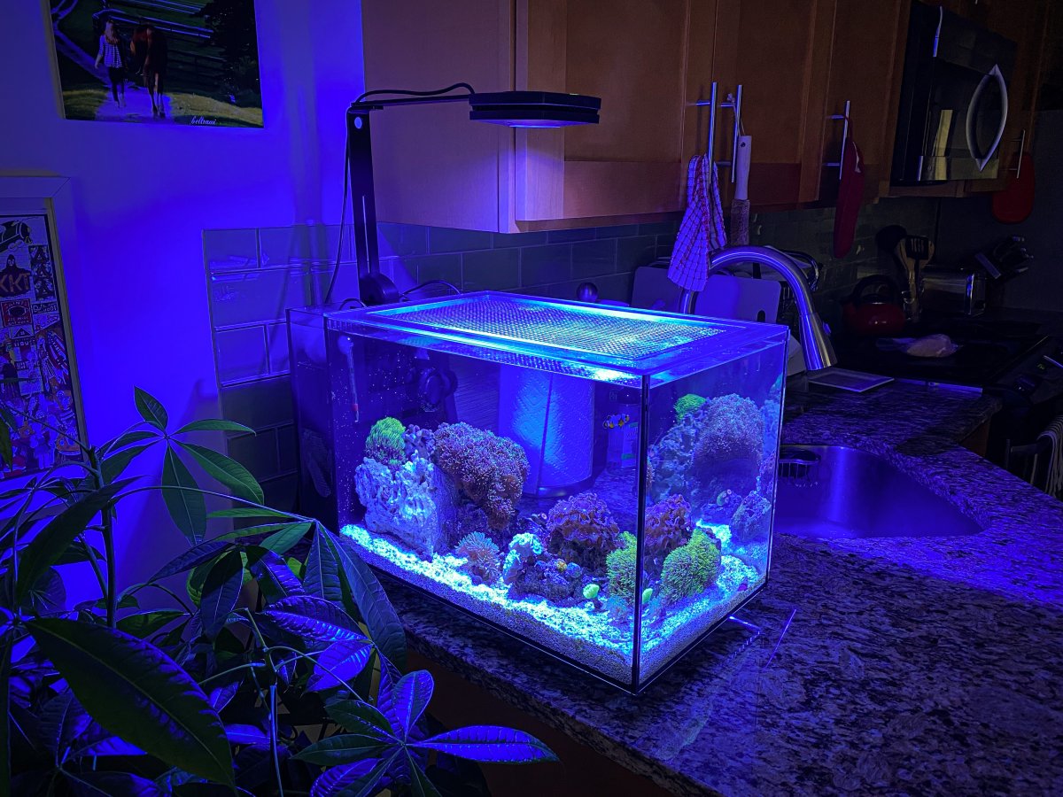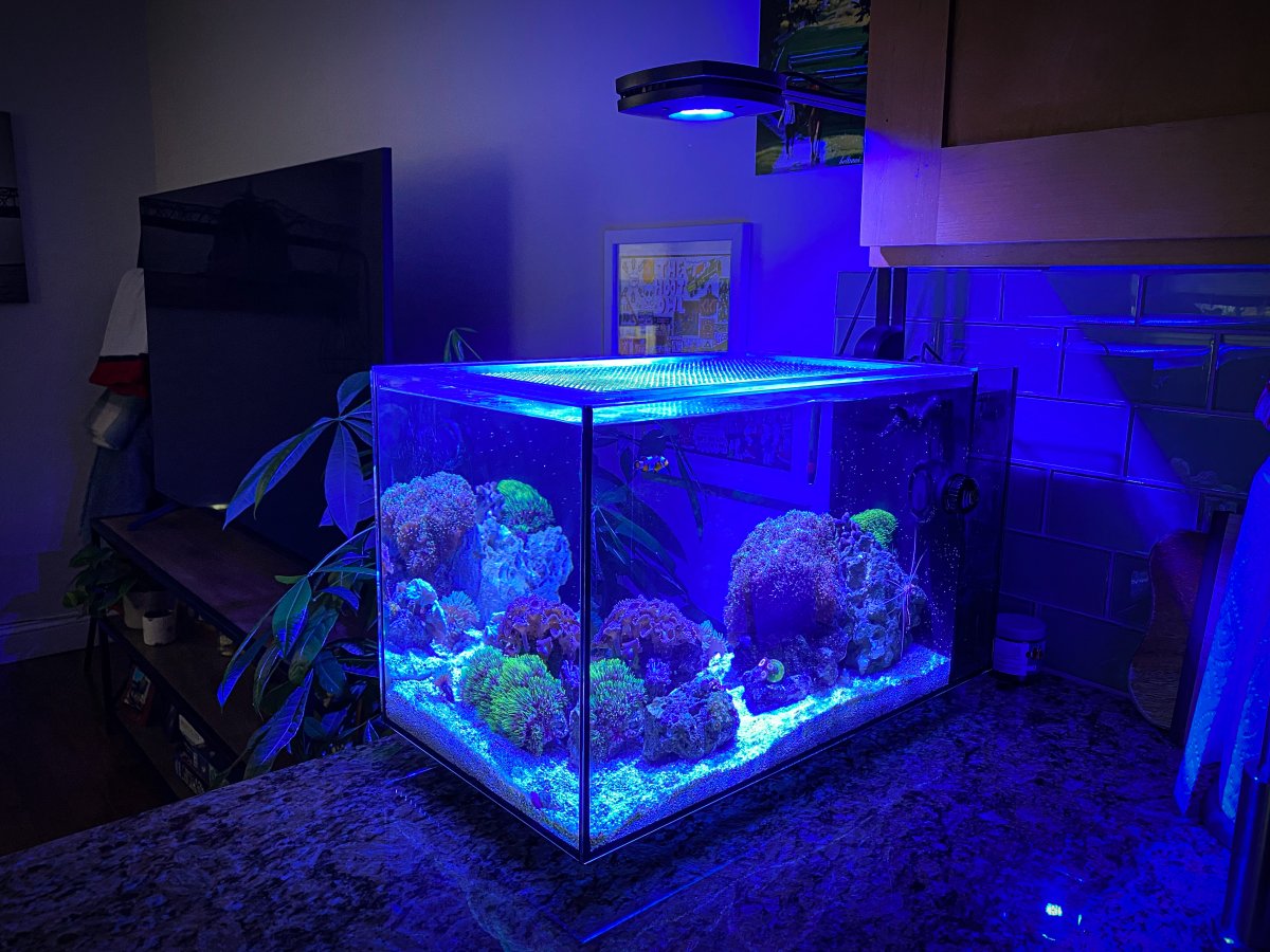 This is a pretty sleek little AIO. It’s the smallest reef I’ve ever owned (and I’ve never had a “big” one) and I can definitely feel the constraint when it comes to the rock work. But I’ve also never had a reef where the coral growth has taken off so quickly. This is a very new reef (just under 2 months), but it’s acting more mature than any other I’ve had at this point. I don’t know if that’s experience, live rock, the natural sea water, or some combination of everything, but I like it.