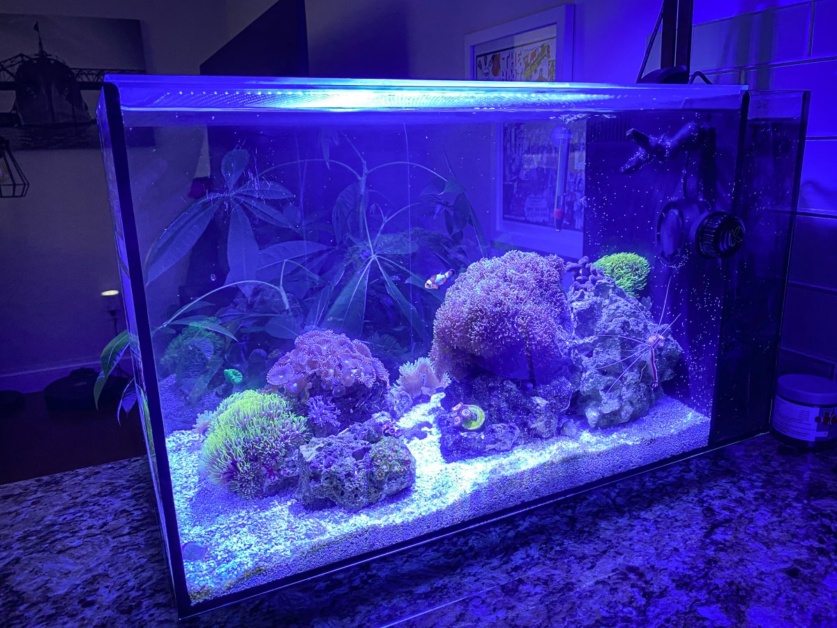 My big challenge is algae. Diatoms came and went quickly. I had some bubble algae on a pice of live rock from the start which spread a little and has since been reduced down to near nothing (with some effort). Honestly, I don’t hate the bubble algae as long as it doesn’t take over. Finally, I had a round of hair algae on the sand bed. That’s now largely receded. I attribute that to operator error. I have about 10 gallons of actual water volume and I’ve always been an over feeder. 10 gallons can’t compensate for the over feeding like a large system can. Nitrates and phosphates never read high, but that’s probably because the algae was consuming it. I dialed back the feeding, started changing out my filter fiber every two days (instead of weekly), and manually removed as much as possible. It’s mostly gone now - lesson learned. I haven’t seen any aiptasia since I removed the section of rock where the colony was growing. I’m hopeful, but it’ll be awhile before I feel confident about it.