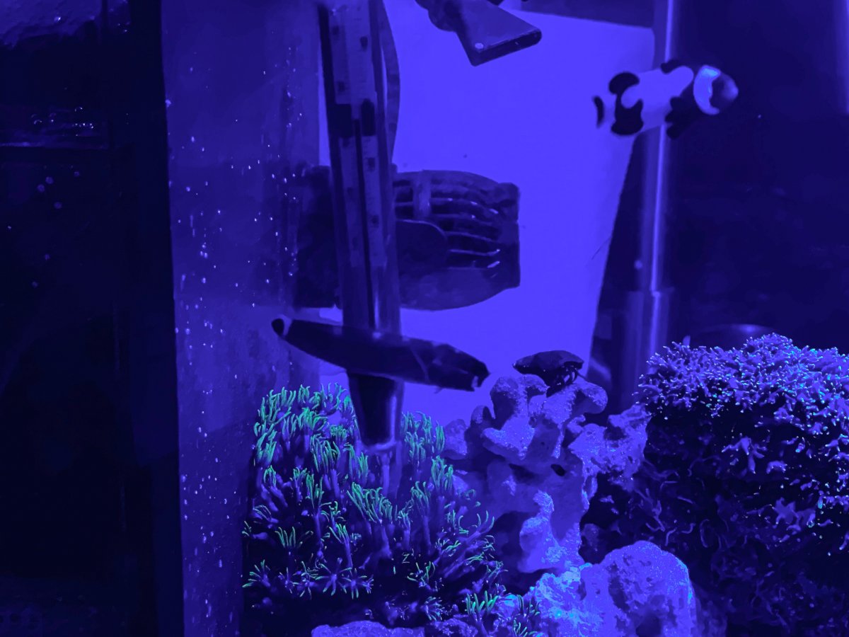 In addition to my Tailspot Blenny, I now also have a small DaVinci clown. It’s tank raised and has a Nemo fin on its right side (or “starboard” since this is marine?). It makes him a little extra wiggly (which my fiancée loves), but he manages more than just fine. He eats like a pig. My favorite thing is that the the blenny seems to have taken to the little guy. I was worried about aggression (blenny was there first), but they are always hanging out together, they eat together, and even sleep together. The blenny had a few spots in the rocks where it used to sleep/hide. The clown took up residence by the thermometer in the back of the tank. Well, now the blenny sleeps next to him, “hiding” (not very well) behind the thermometer too. I had always said I’ll get a 3rd fish (likely a second clown), but 2 may be just fine.