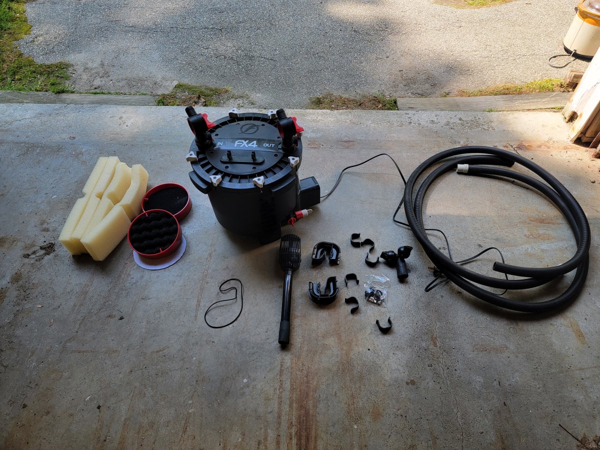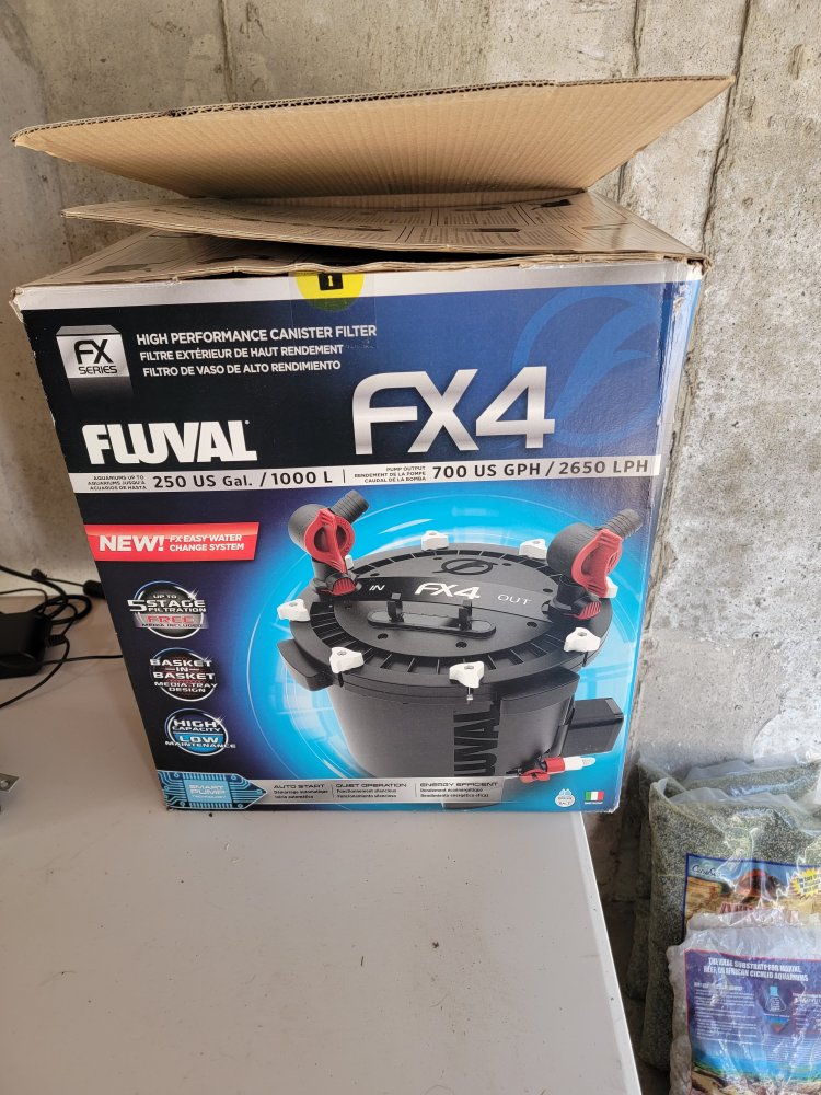 Brand new Fluval FX4 Canister filter. I had planned to set up an overstocked 40 gallon cichlid tank but never got around to it. This filter has only been opened, converted to use biohome ultimate filter media, tested with some buckets of water and then put back into the box. I still have all the original media that it came with if you do not want to use the biohome ultimate media.