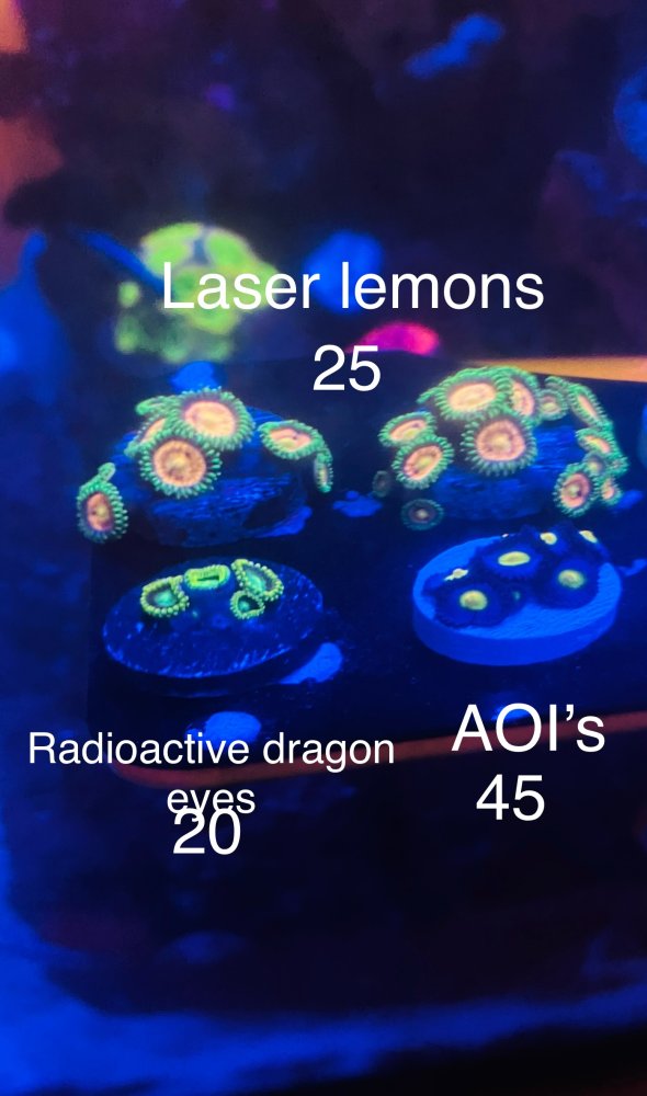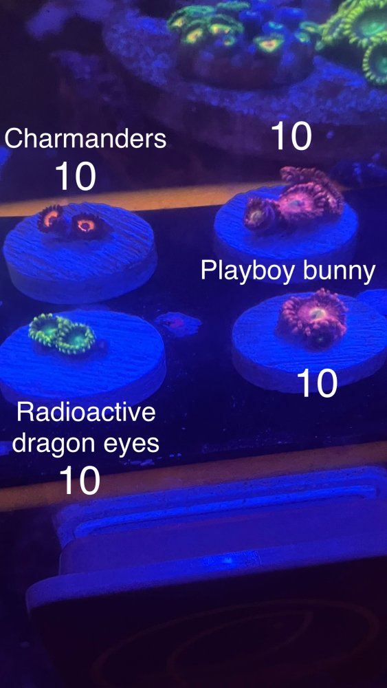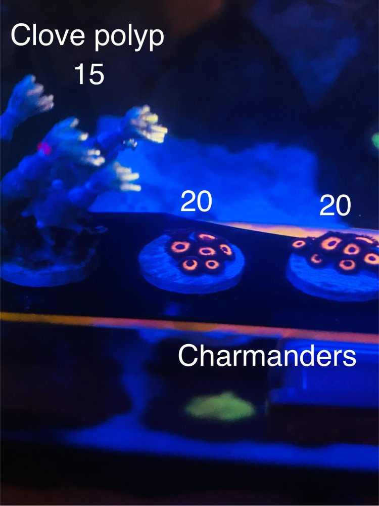 I have some frags for sale, I wouldn’t mind trading as well. Right now I’m using stock biocube lights (in the process of upgrading) and I took the photos with my iPhone so the clarity isn’t that great. I added pics of the charmanders under daylight channel because they did not photograph well under blues for me. I’m in voluntown CT but I work in Southborough mass. Prices are in the pictures.