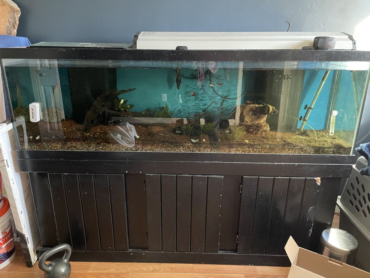 Quarter inch glass, double overflow. Lock line returns. The stand could be in better shape, but it will definitely keep your fish safe. Currently has some freshwater fish only.