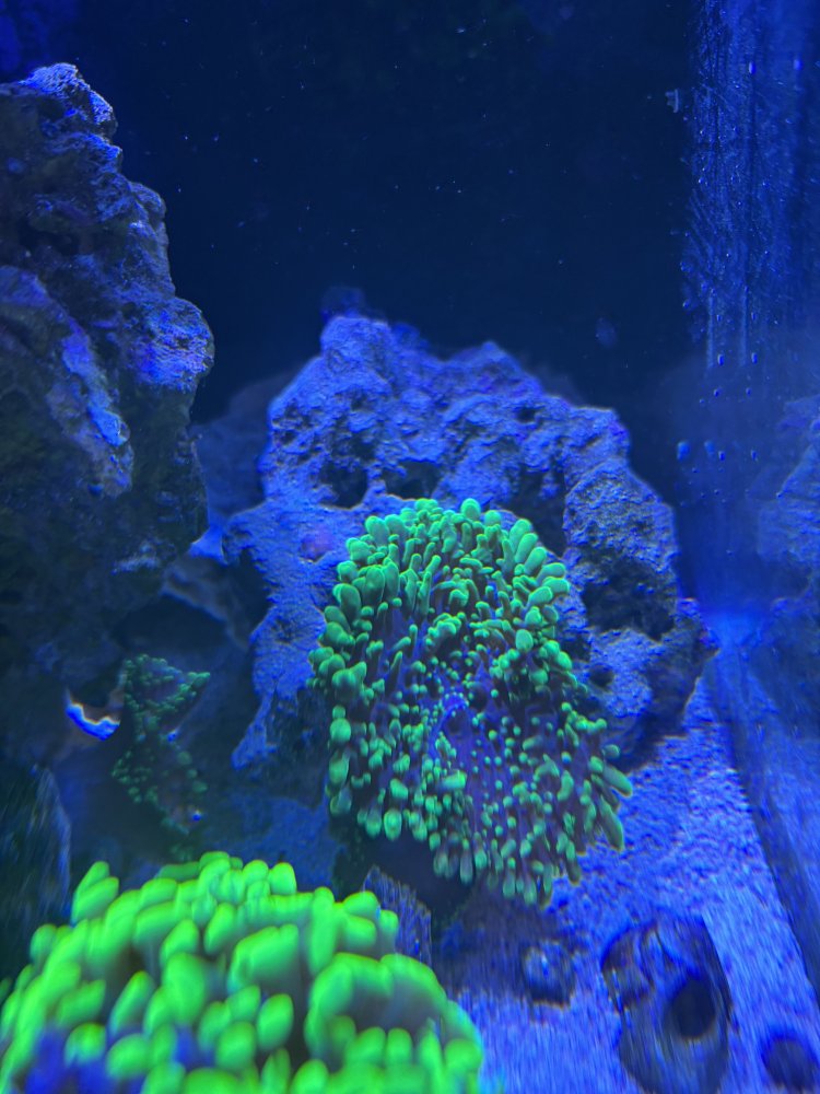 1 fuzzy green mushroom head on a small piece of rock. $20 or trade. Excellent beginner coral.