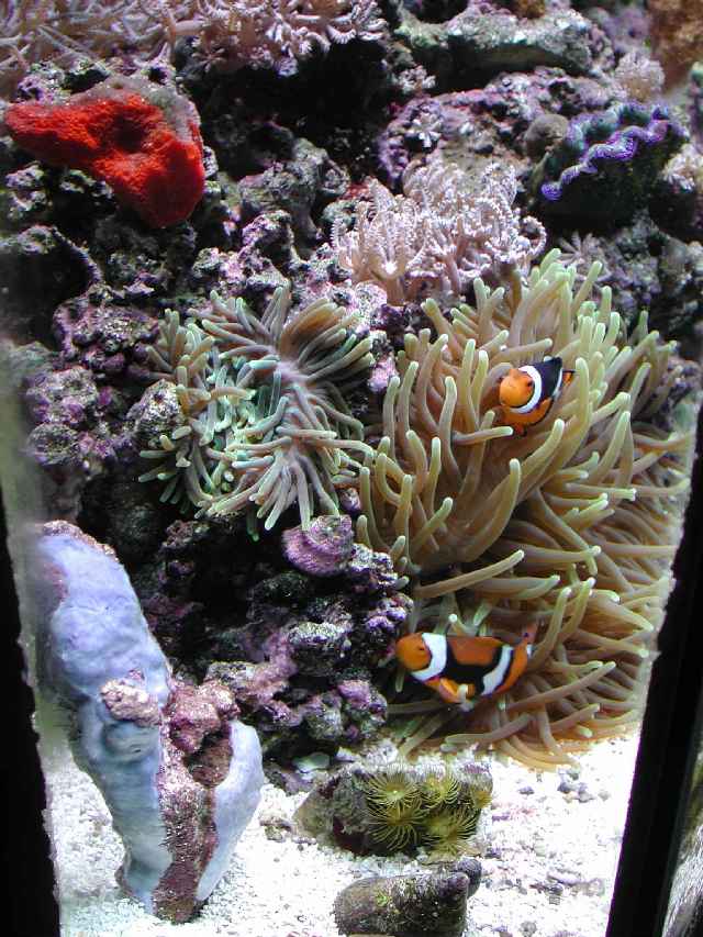 The lights aren't on, but with the room light the anemone and clowns show up well. (the thing flying around the tank is the feeding cage which came loose)