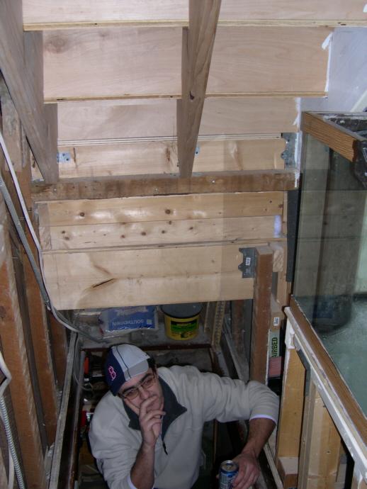 Here's Neo trying to figure it all out. He's on the stairs down to the basement. It's not very wide. Note the black circle we drew on the tank where we were going to drill. An elbow there would jut out into the hallway and always get bumped.