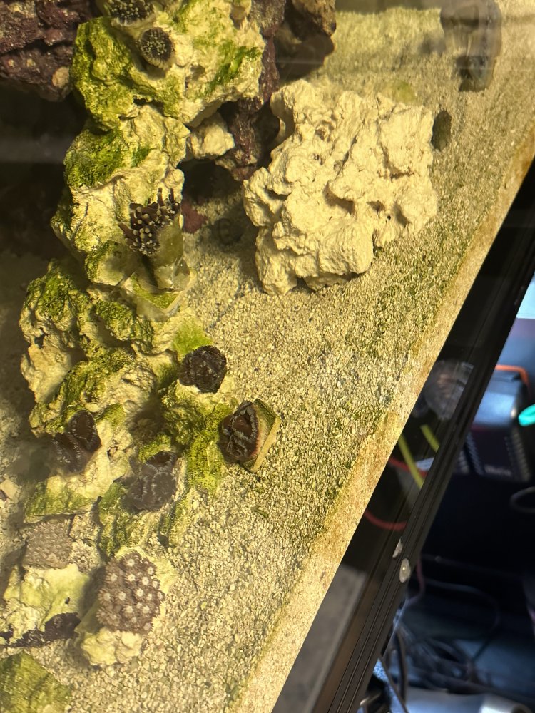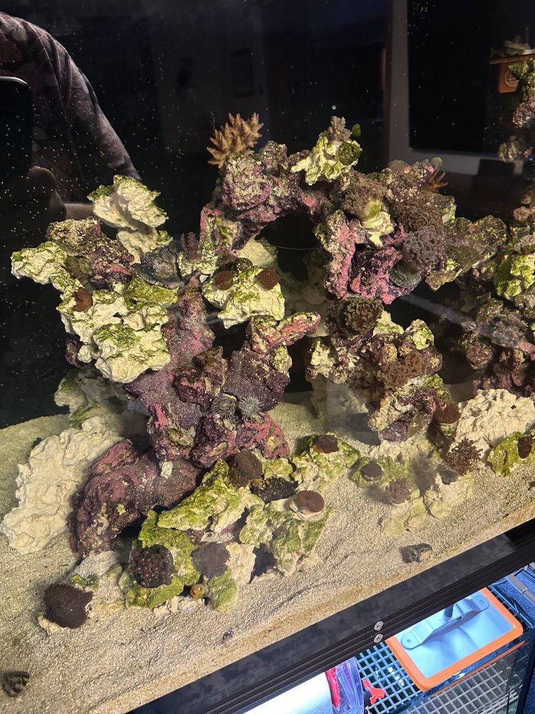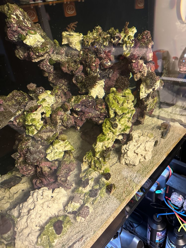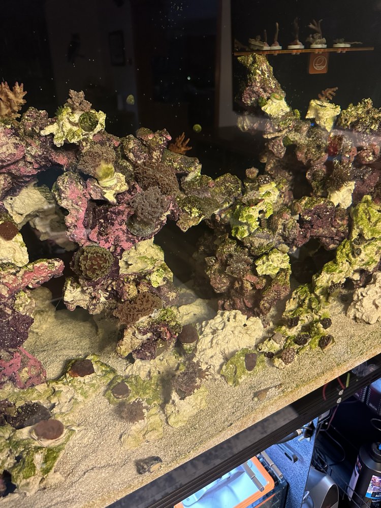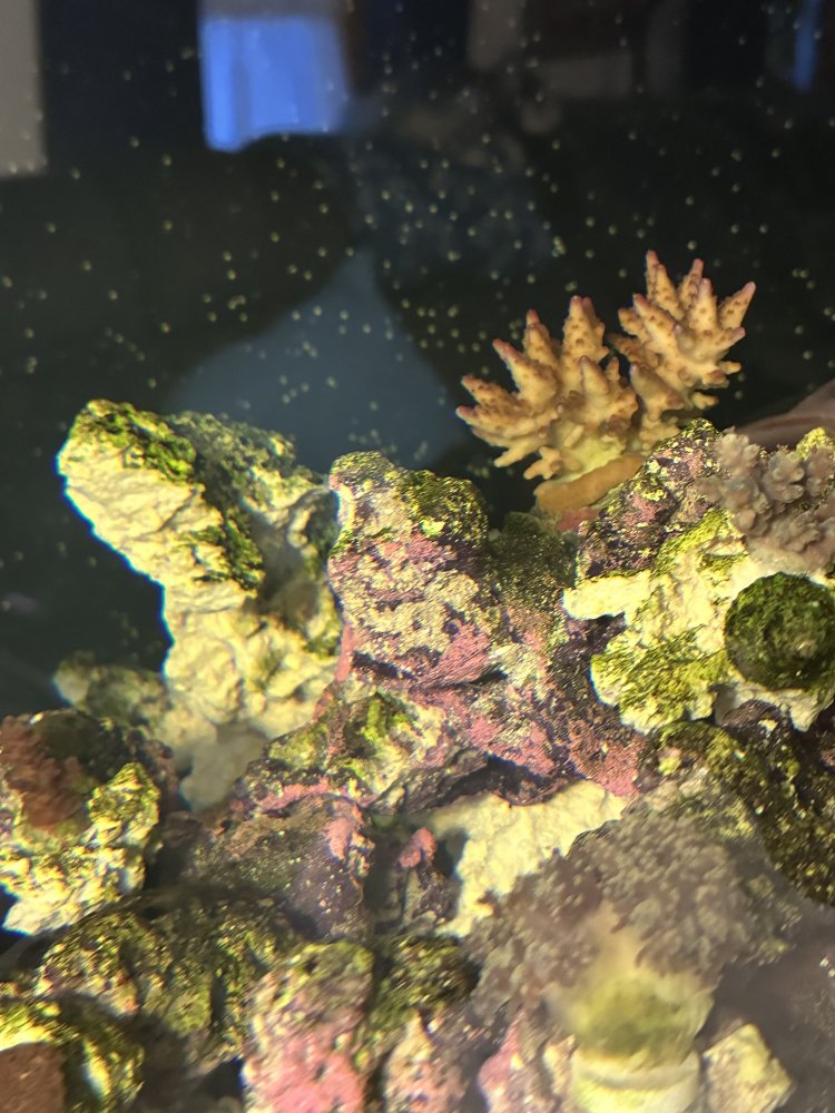 Hello - I was able to finally get some pictures of the tank with no LEDS and only using the living room light early in the morning - at this time Of day with fluorescent lighting - the green algae is pretty much limited to all my rock work and “speckles” on the sand - as you can imagine - totally different when LEDS on and it all takes on an gold/brown cast making me think Dino’s - nothing hairy - nothing bubbly - just thinking this is just plan normal algae and part of the expected uglies in a 3 month old tank - am I correct?